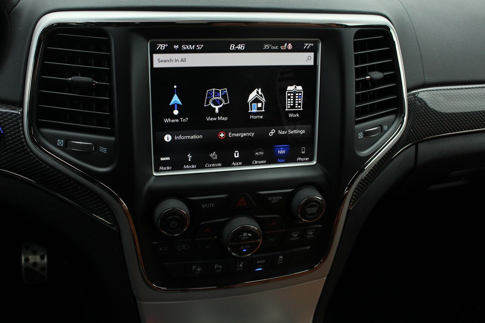 The Uconnect infotainment system is top-notch as well, with all the connectivity features you could want including navigation. On the center console, you have the drive mode selector. This allows you to put the car in different drive modes depending on the road conditions. It also allows you to access Launch Control, which helps you get the best possible launch off the line.