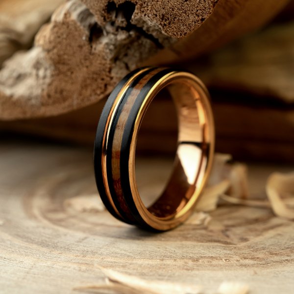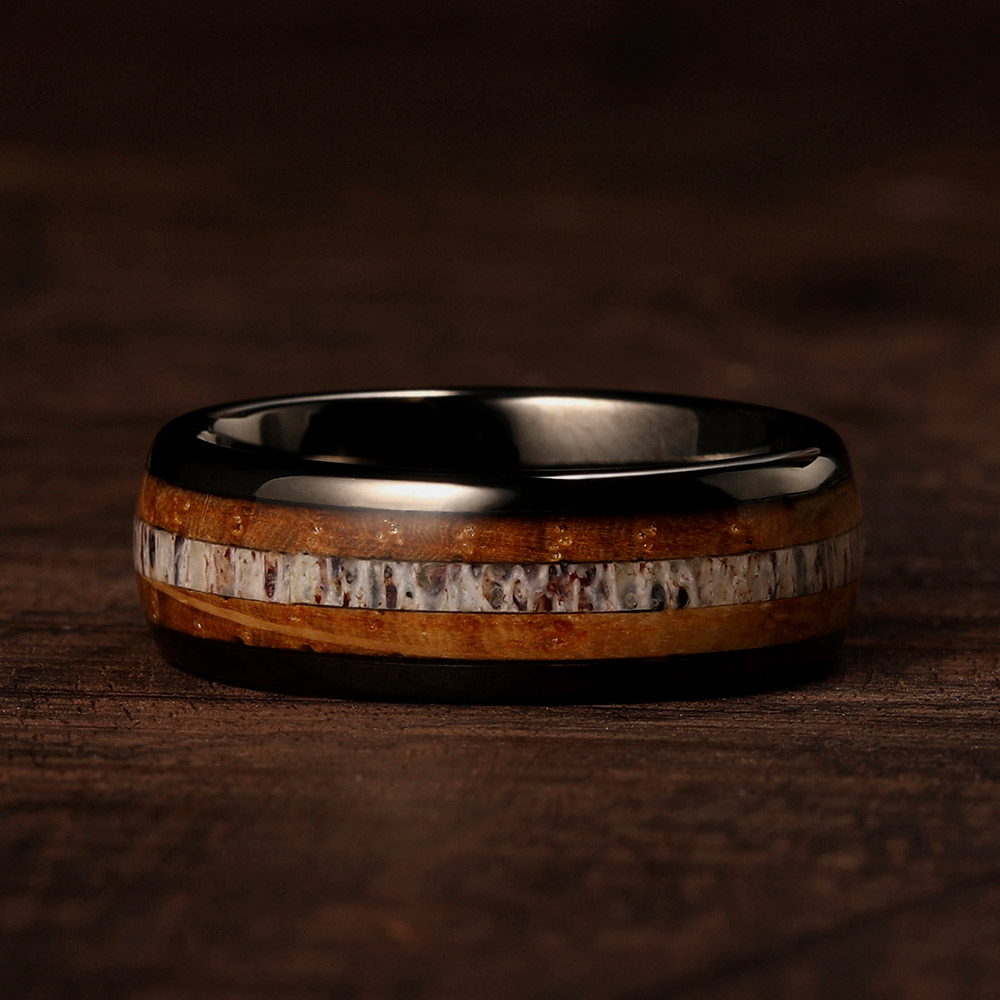 A robust loop of highly durable tungsten carbide contains a unique triple-inlay design that immediately catches the eye – say hello to the Huntsman Rin. A single ringlet of polished elk antler is nestled between twin ribbons of authentic aged whiskey barrel oak. Contrasting colours and stunning textures bring a look that is aged to perfection.