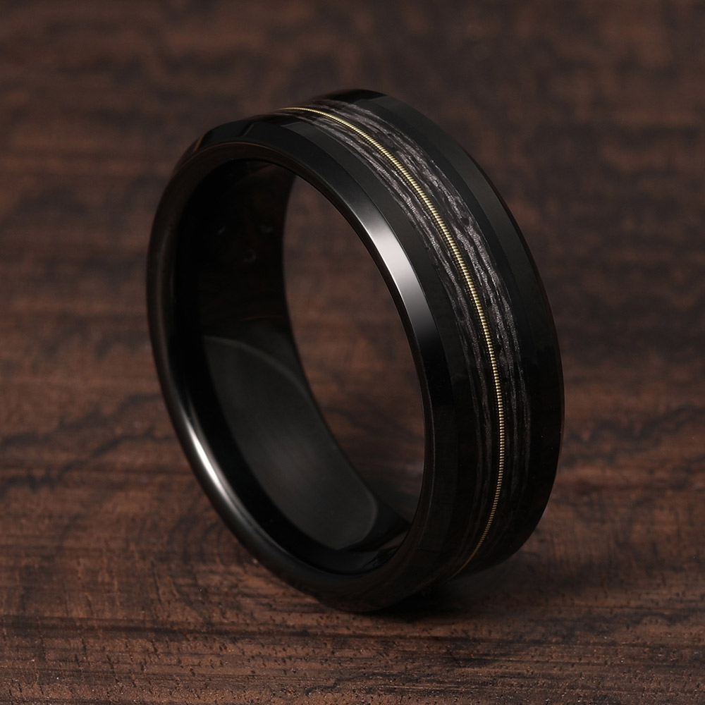 Here’s something really unique for music lovers out there: a polished black ceramic band that contains a burnished grey oak inlay that cradles a distinctive golden guitar string. The hypnotic aesthetic of circles within circles celebrates a perpetually meaningful melody that always sounds just right.