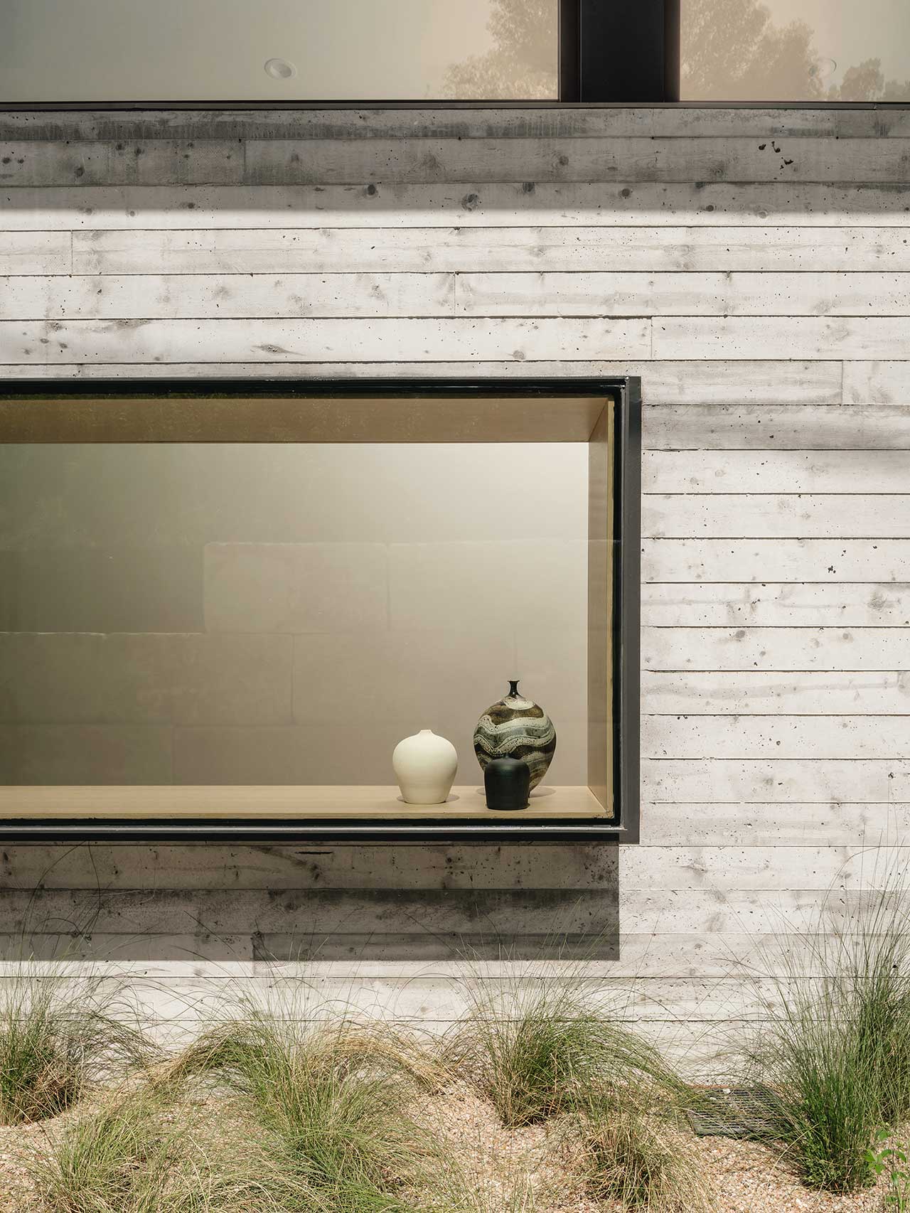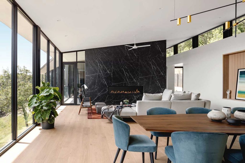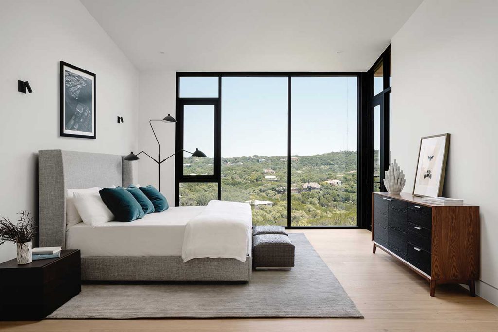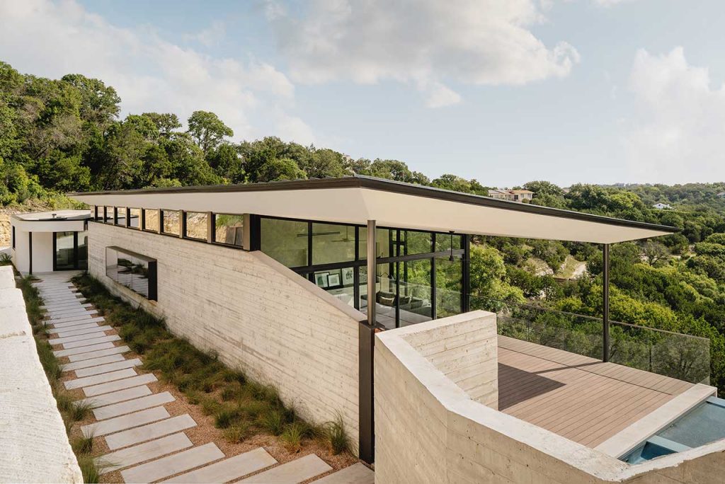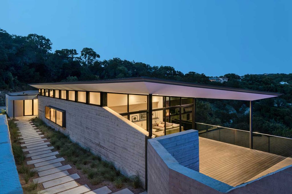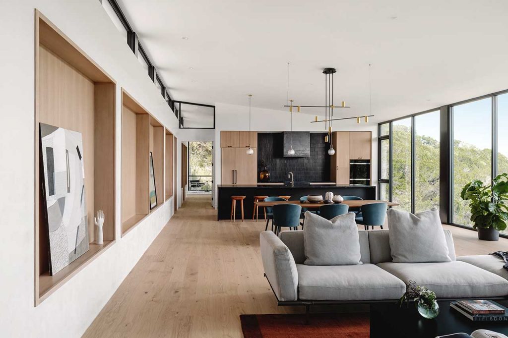 At Sherman Residence, there is a walkway leading to the front door that runs adjacent to the driveway. The exterior wall of the superbly contemporary home is punctuated with a protruding box window that frames views looking both inside and out. The northern side of the Austin based home is open-plan with a kitchen, dining room and living room that has been purposively positioned to face the canyon through black-framed floor-to-ceiling windows.
