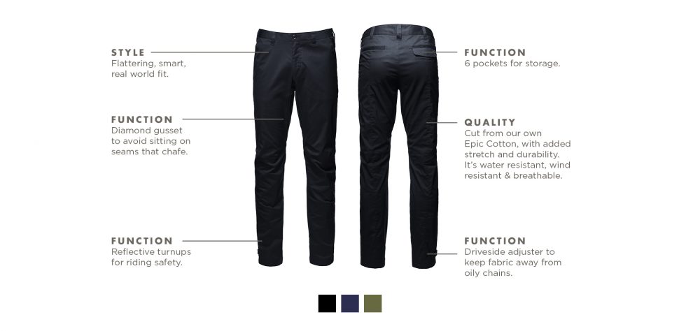 Available in three different colours to suit your own personal tastes, the Vulpine Tailored Rain Trousers boast an impressive amount of pockets (six no less) for storage, reflective turn-ups for safer riding, made from a stretchy cotton to provide the flexibility required when riding and a driveside adjuster which will keep your stylish trousers away from oily chains and keep them looking the part upon your arrival.