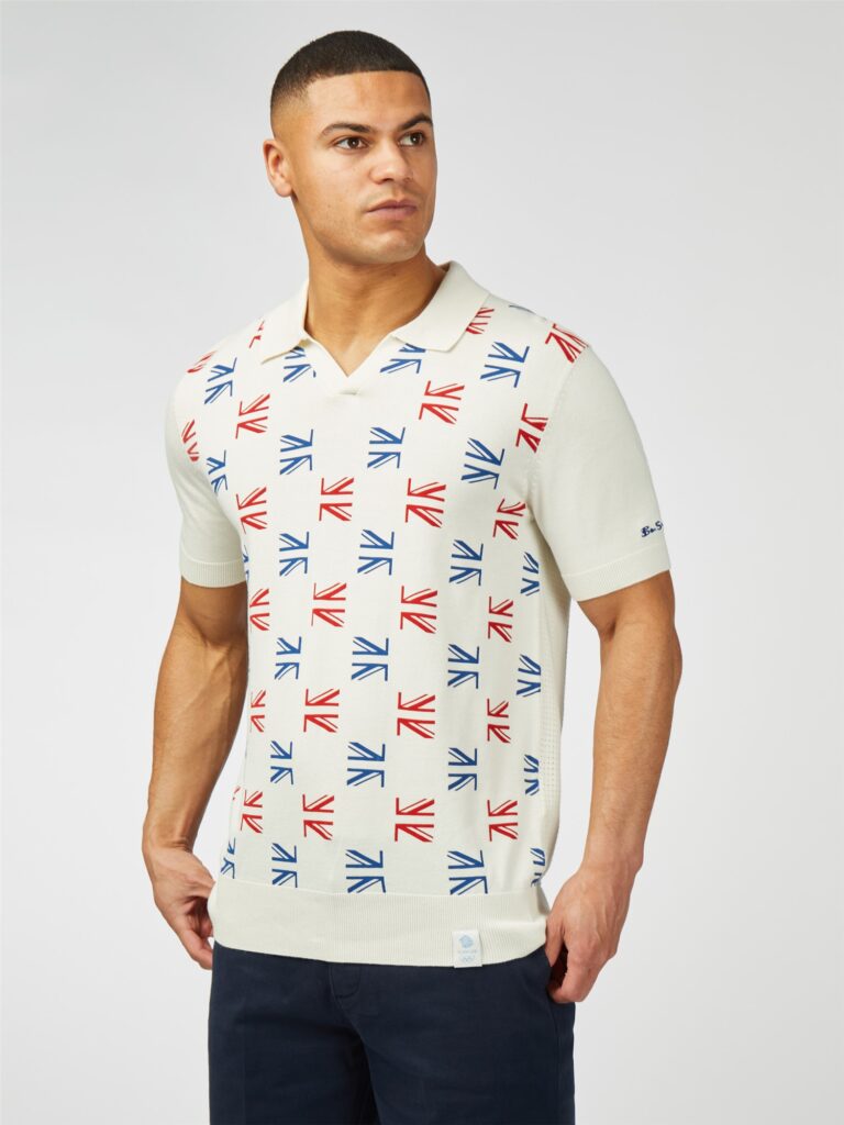 In collaboration with Team GB for the Paris Olympics, Ben Sherman has crafted a knitted open neck polo from an organic cotton blend. This unique polo features a geometric union flag design in the colours of Great Britain. It includes specially developed Olympic woven labels made from 100% recycled polyester and a Ben Sherman embroidery on the left sleeve, blending style with eco-consciousness.