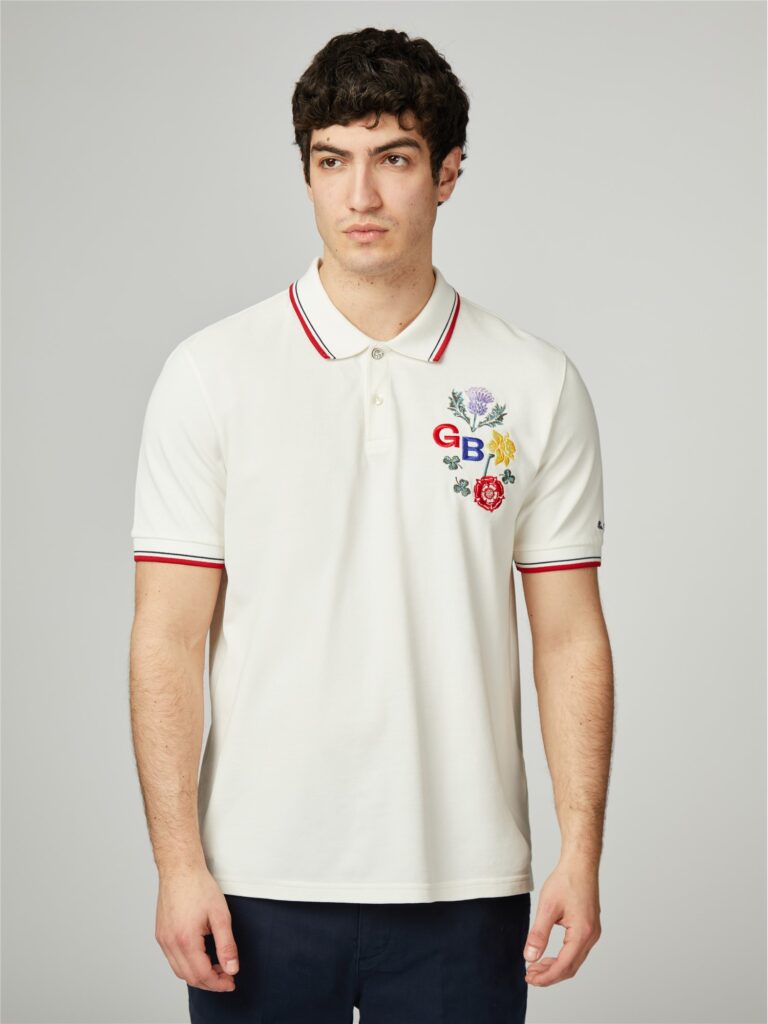 Ben Sherman has crafted a relaxed fit polo made from organic cotton. This design features contrast signature mod tipping and chest embroidery incorporating Great British flowers. Additional details include a “Ben Sherman” sleeve embroidery and a Team GB hem label, adding distinctive branding to this stylish piece.