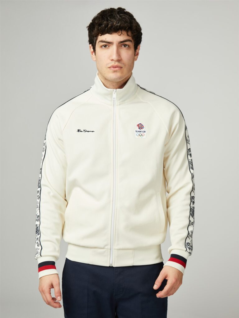 Ben Sherman has designed a track top from a recycled polyester blend, inspired by Great British flowers. This track top features unique floral-printed knitted tape along the outer sleeves. It includes specially developed Olympic woven labels made from 100% recycled polyester. The regular fit design is finished with a Ben Sherman embroidery on the right chest and a Team GB embroidered patch on the left chest.