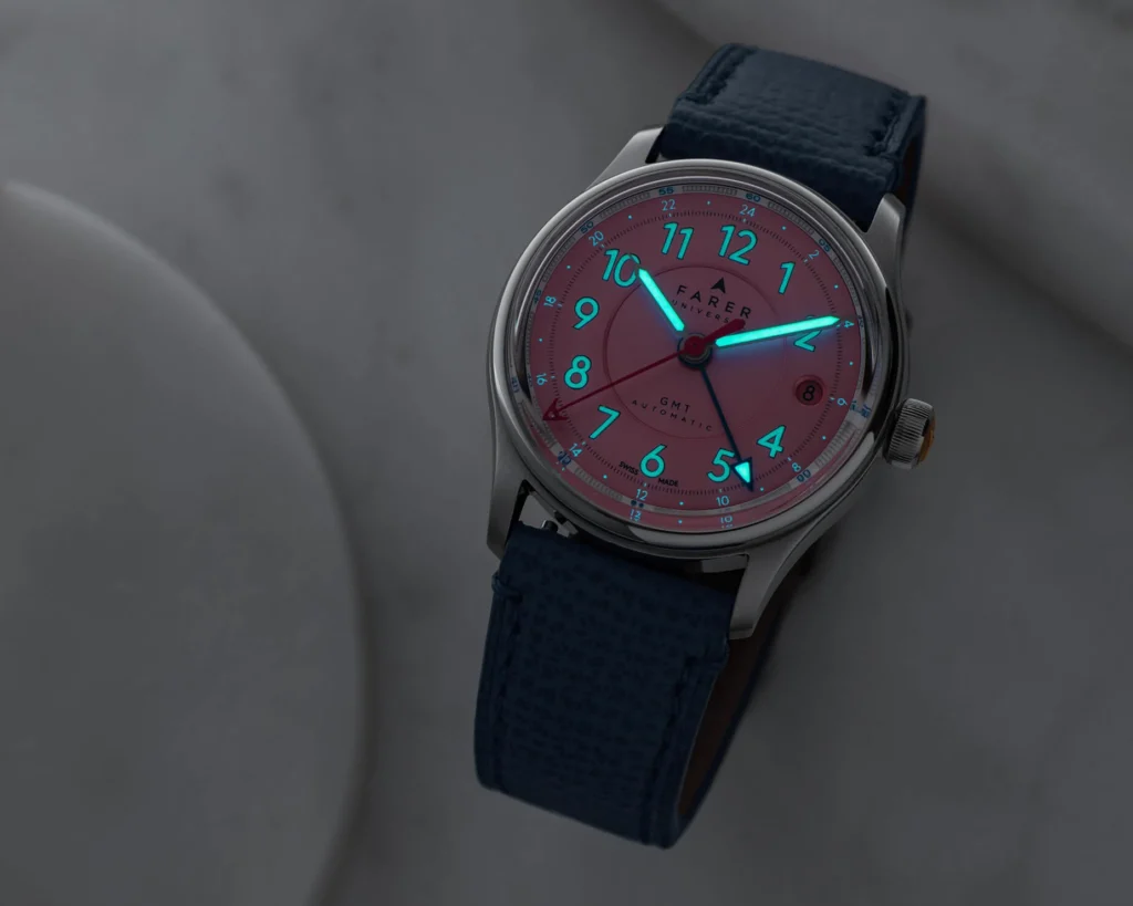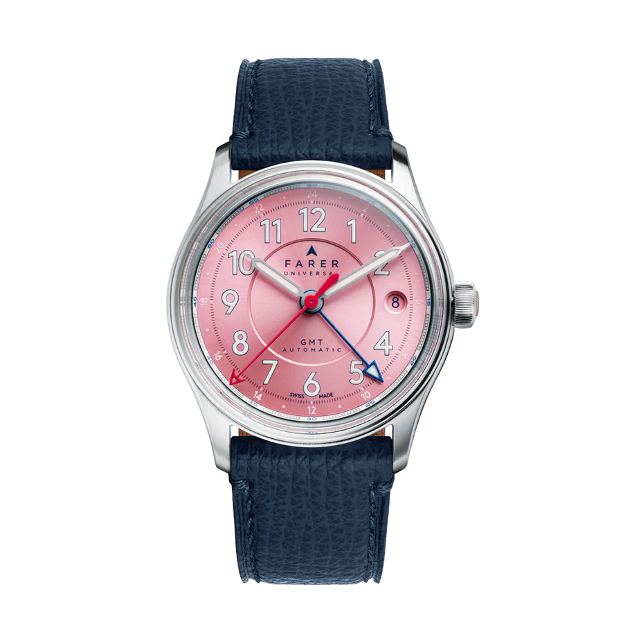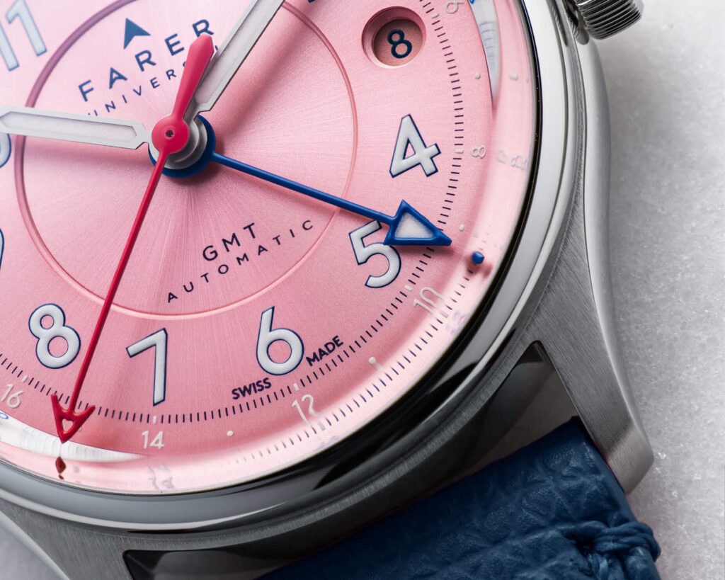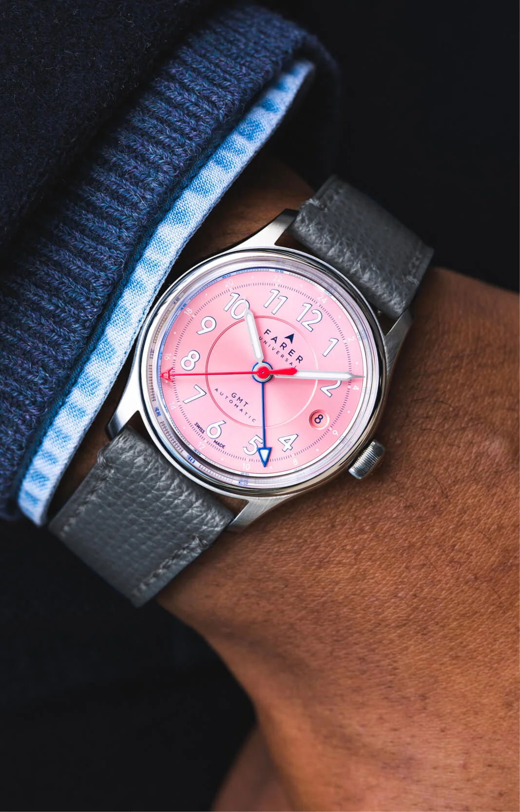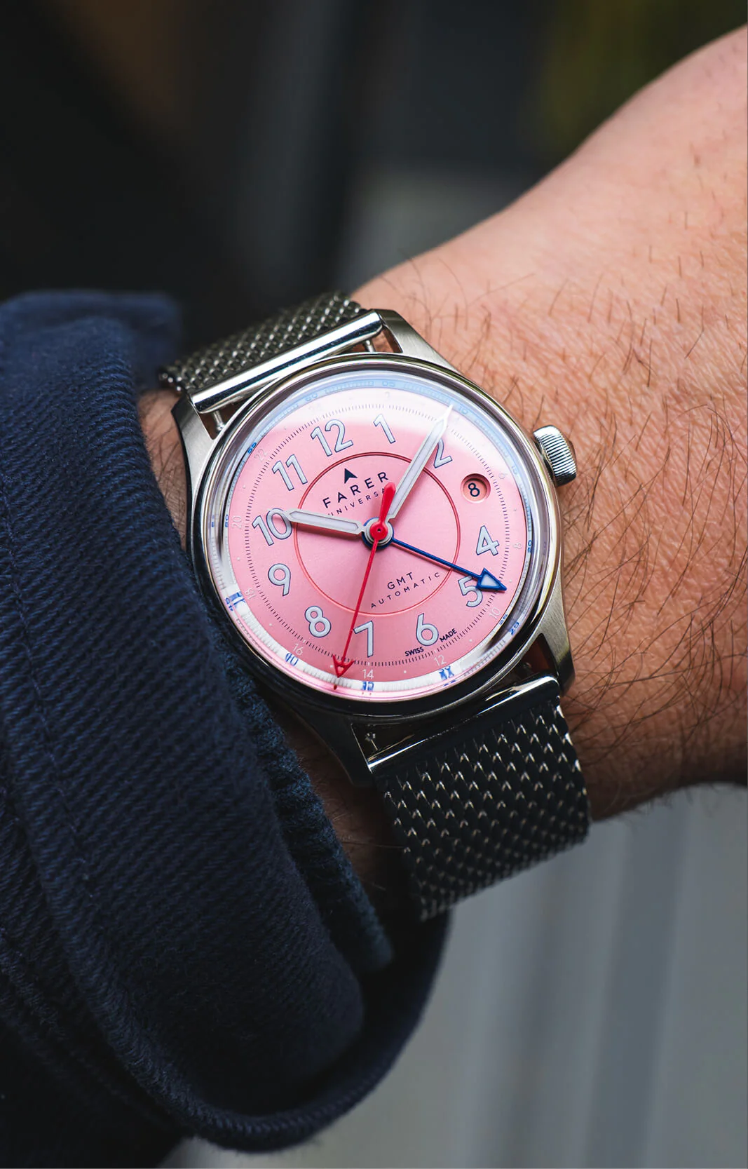 The first thing that grabs you is that dial – a mesmerising pink sunburst finish that manages to be bold yet surprisingly versatile. Farer calls it ‘charming’, and we’d have to agree. It catches the light beautifully, bringing the triple-stepped design to life. Contrasting against this backdrop are crisp, white Arabic numerals, generously over-printed with Super-LumiNova and subtly outlined in blue, ensuring legibility day or night. The date window is cleverly colour-matched, maintaining the dial’s harmony, while the distinct blue GMT hand points to the inner 24-hour scale, ready for your next trans-continental jaunt. Add the polished silver syringe hour and minute hands, also lumed, and a striking fuchsia seconds hand tipped with the signature Farer ‘A’, and you have a dial that’s pure joy to behold.