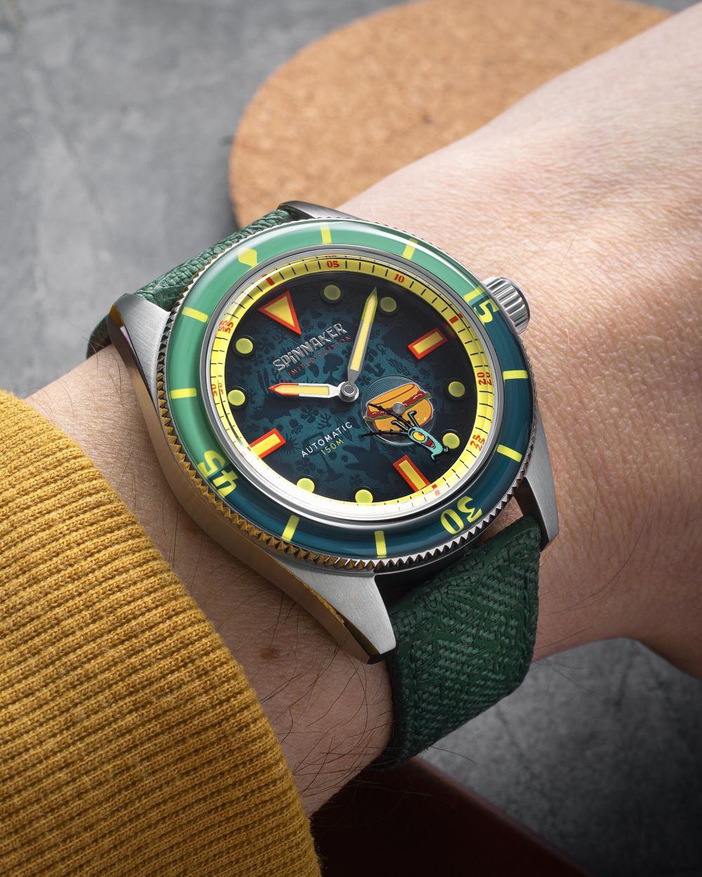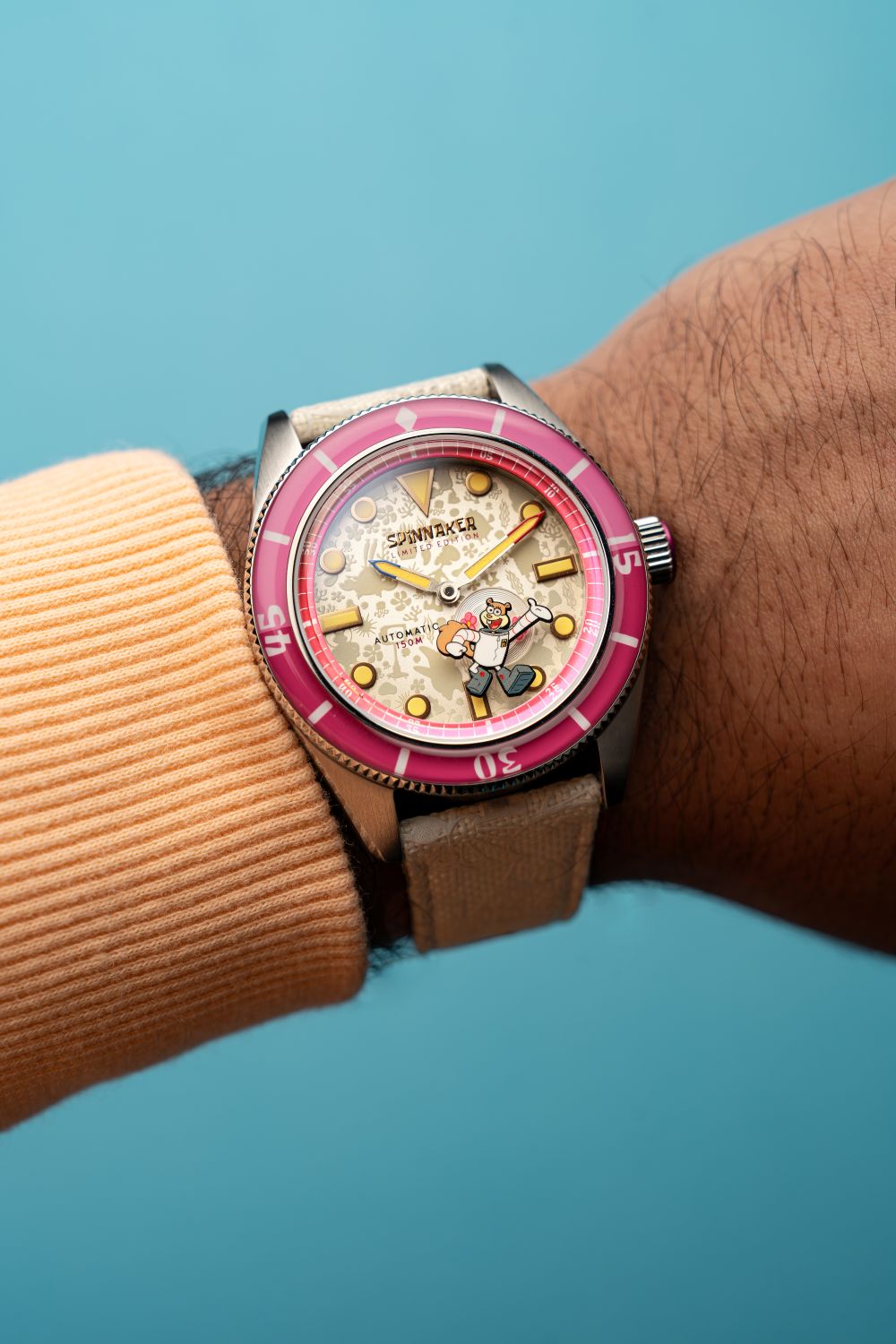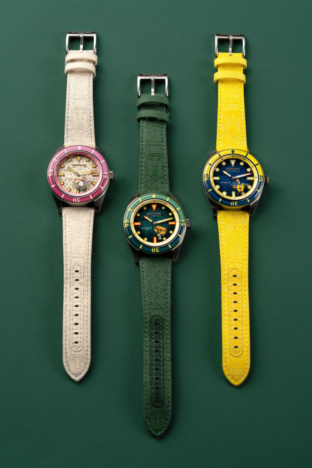 Each timepiece in the collection is powered by a precise Japanese 2-hand movement, subtly enhanced with a refined small seconds hand, adding a touch of traditional horological detail to the inherently whimsical design. True to Spinnaker’s diving watch heritage, legibility is paramount, with the bezel and dial generously treated with Swiss Super-LumiNova, ensuring a vibrant and enduring glow in low-light conditions – a functional imperative for any serious dive instrument, and a playful nod to the bioluminescent depths of Bikini Bottom.