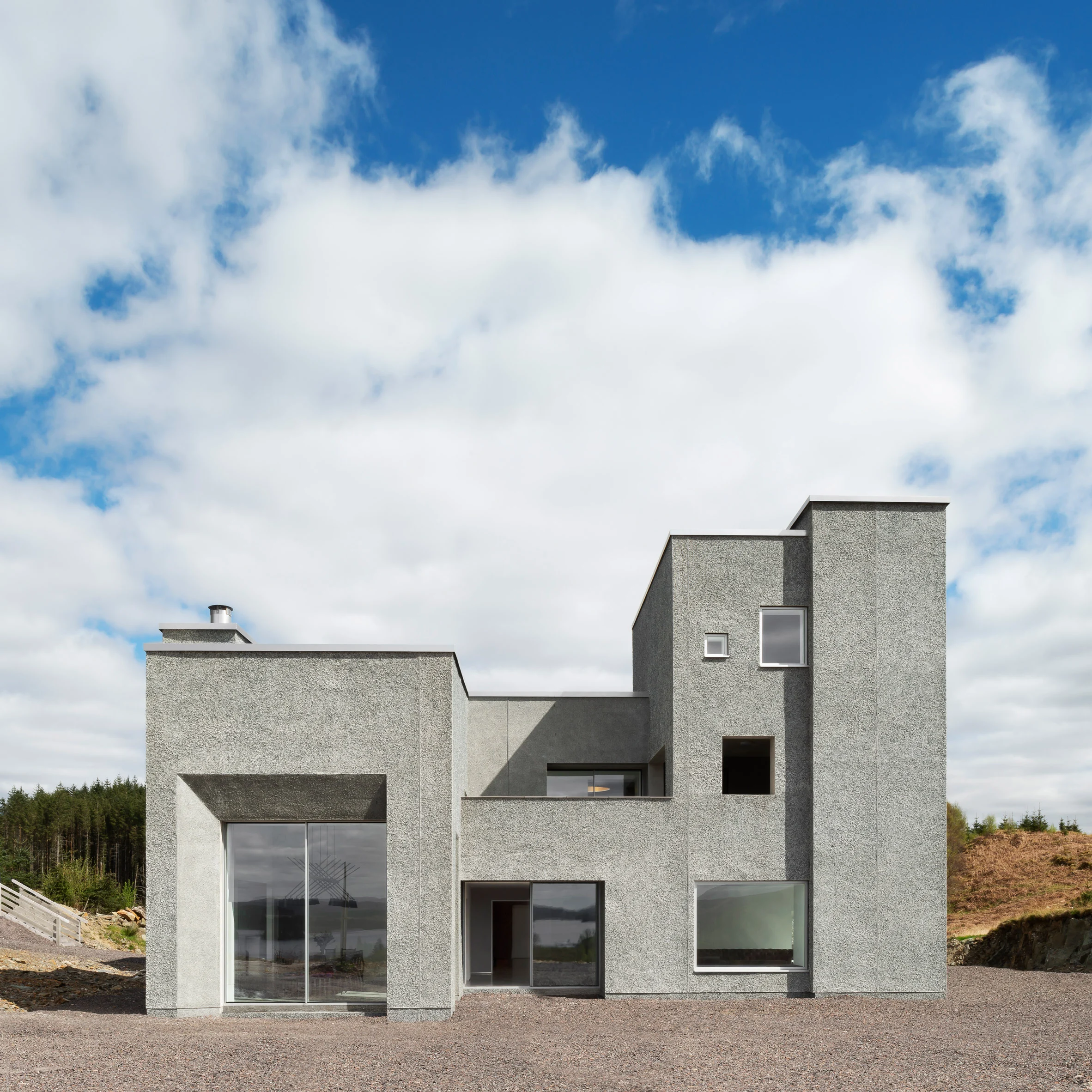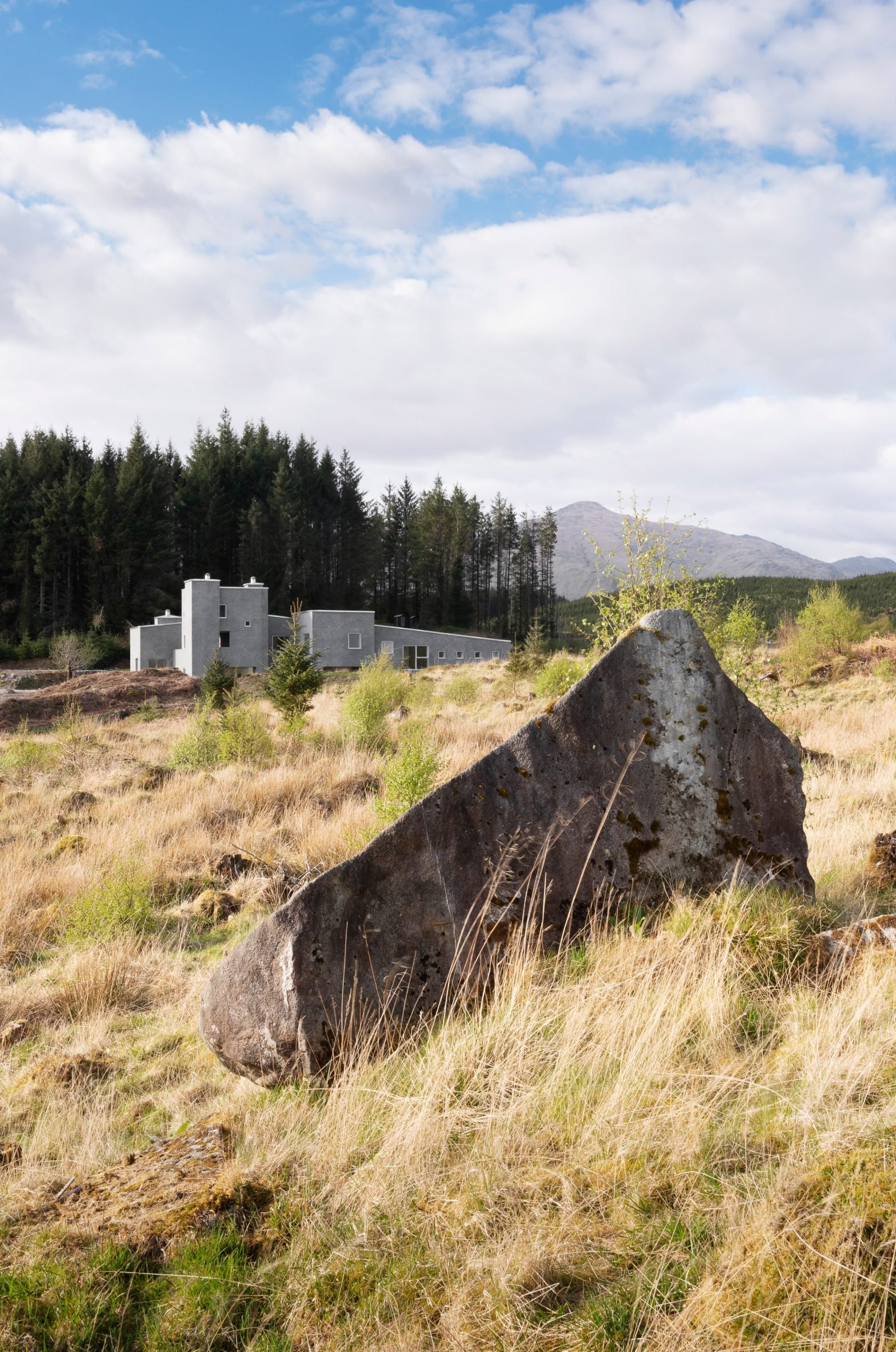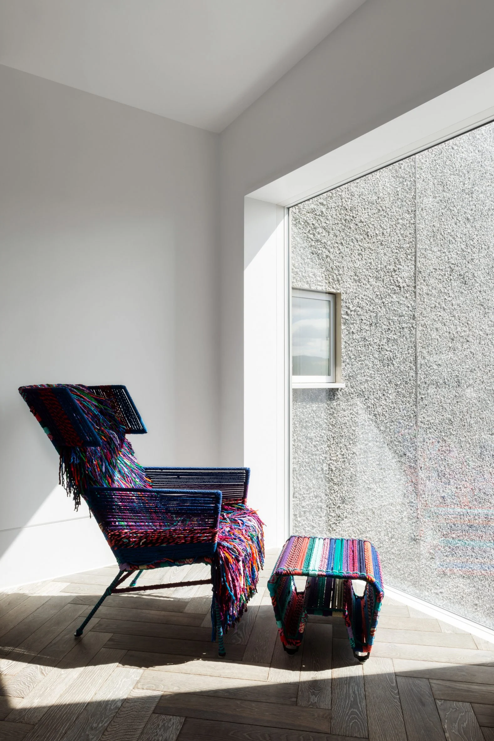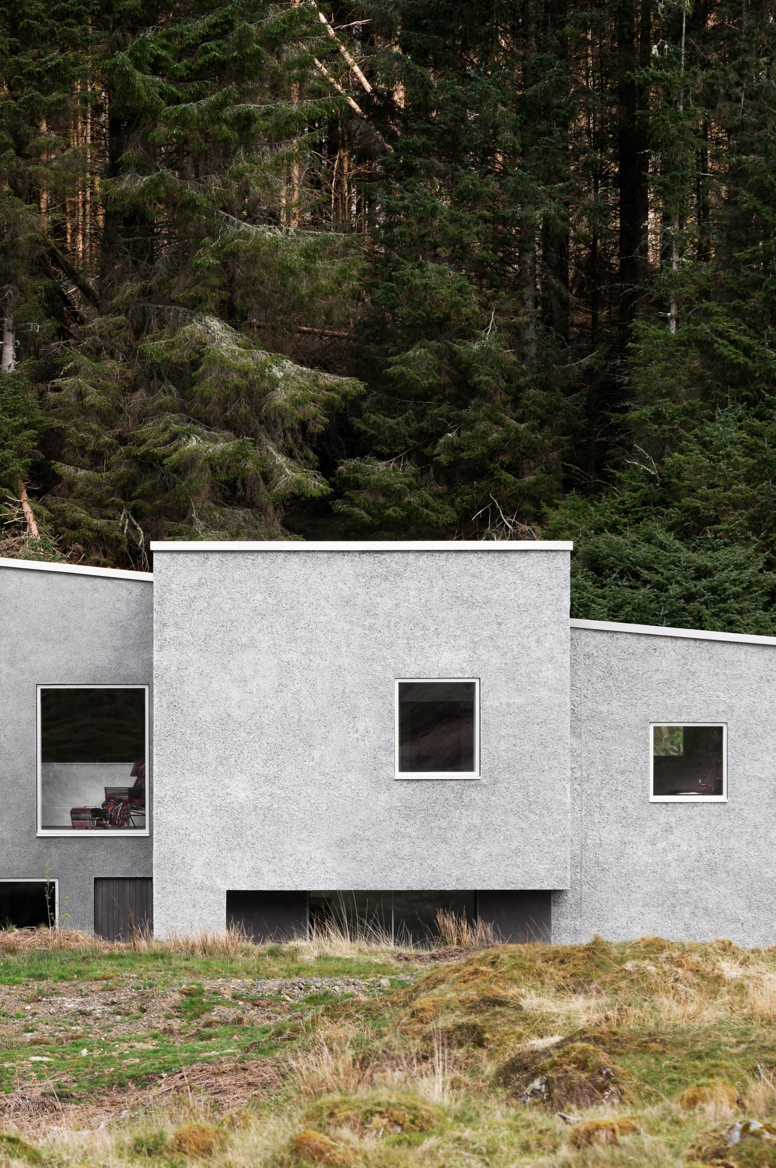 One of the most striking design features of Hundred Acre Wood is, as you’ve likely noticed, its facade, which is covered in recycled and crushed TV screens for a low-maintenance, pebbledash-like finish. This was an idea conceived and developed by Denizen Works as a take on a traditional Scottish harling – a rough wall finish that is made from lime and aggregate and it delivers an impactful visual to say the least.