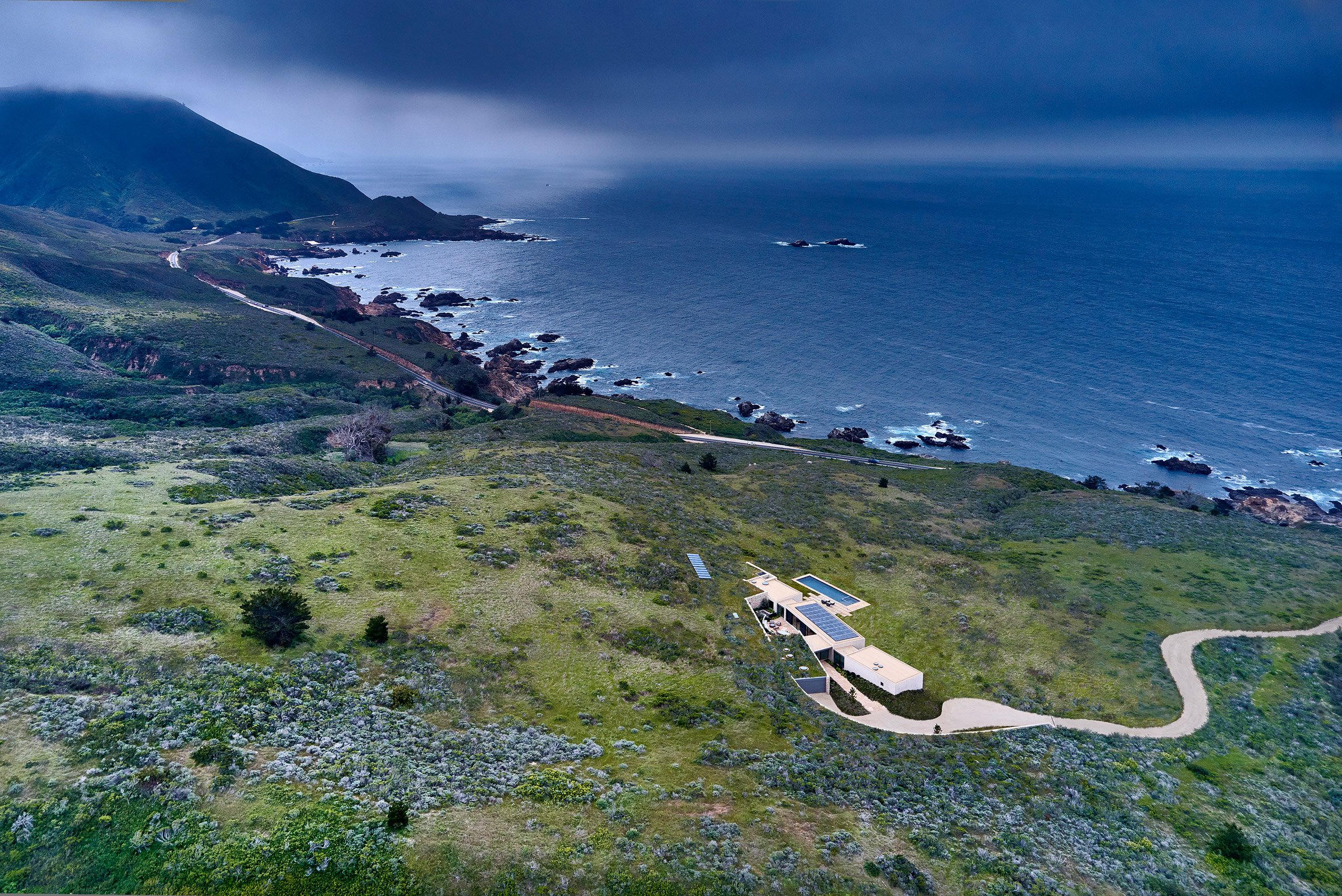 The west side of Mal Paso Residence from Studio Schicketanz, which faces the sea, has a central communal block and two bedroom wings that offer amazing views of the Californian coastline. The east side of this sensational home, which abuts a curved retaining wall, contains two further buildings. One is where you’ll find a garage, bedroom, bathroom and laundry facilities, while the other contains a billiards room.
