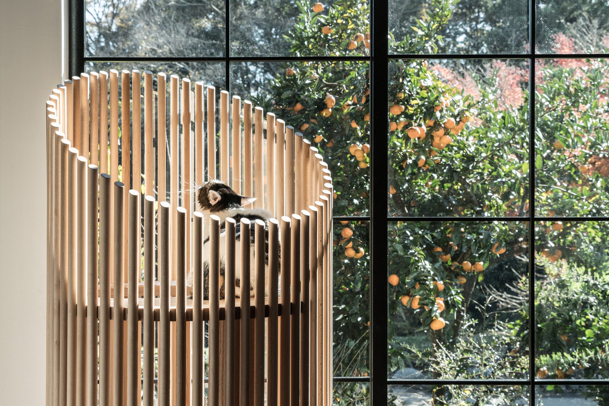 Boasting a form that facilitates comfortable climbing for the cat as it ascends and descend the frame, the Neko Modern Cat Tree is a vertically oriented design which is covered in natural wood and, as most cats like their space, it provides a private area for the cat to relax and unwind high up from the floor whilst also serving as a attractive interior object that fits effortlessly with your interior design aesthetic.