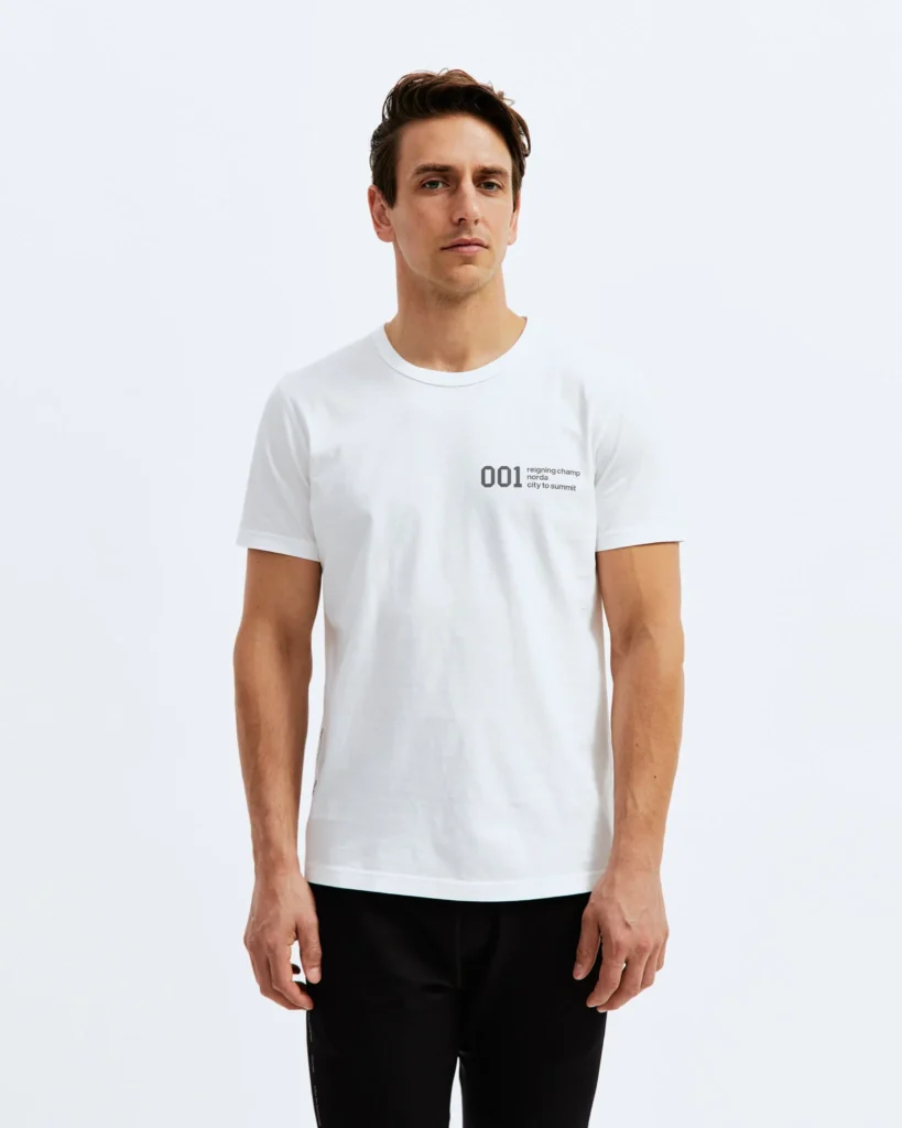 Norda™ and Reigning Champ have joined forces to create a line of trail running apparel that is both high-performance and stylish. This reflective running T-shirt is made from lightweight jersey fabric and features co-branded heat transfer graphics. It has a trim athletic fit, a durable rib-bound collar, set-in sleeves, and flatlock seams.