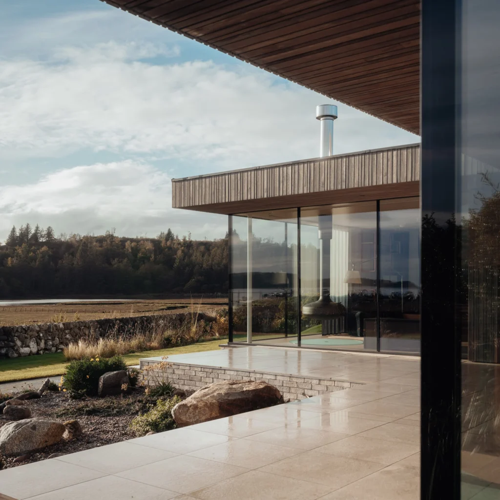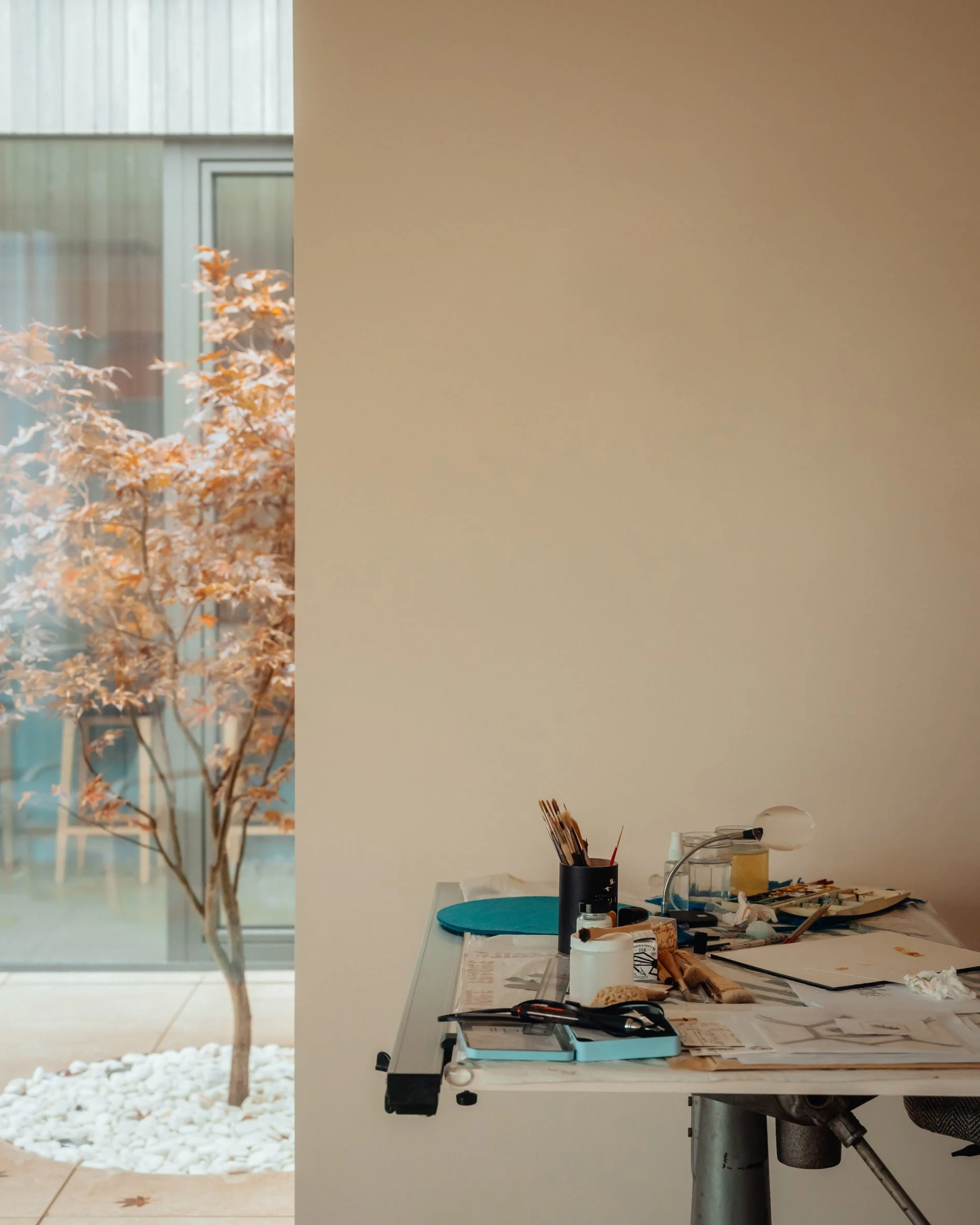 The studio space, designed for quiet contemplation and creative pursuits, is largely separated from the main house, offering a sense of seclusion. A glazed corner ensures that this space remains bright and connected to the surrounding landscape, providing inspiration for artistic endeavours.