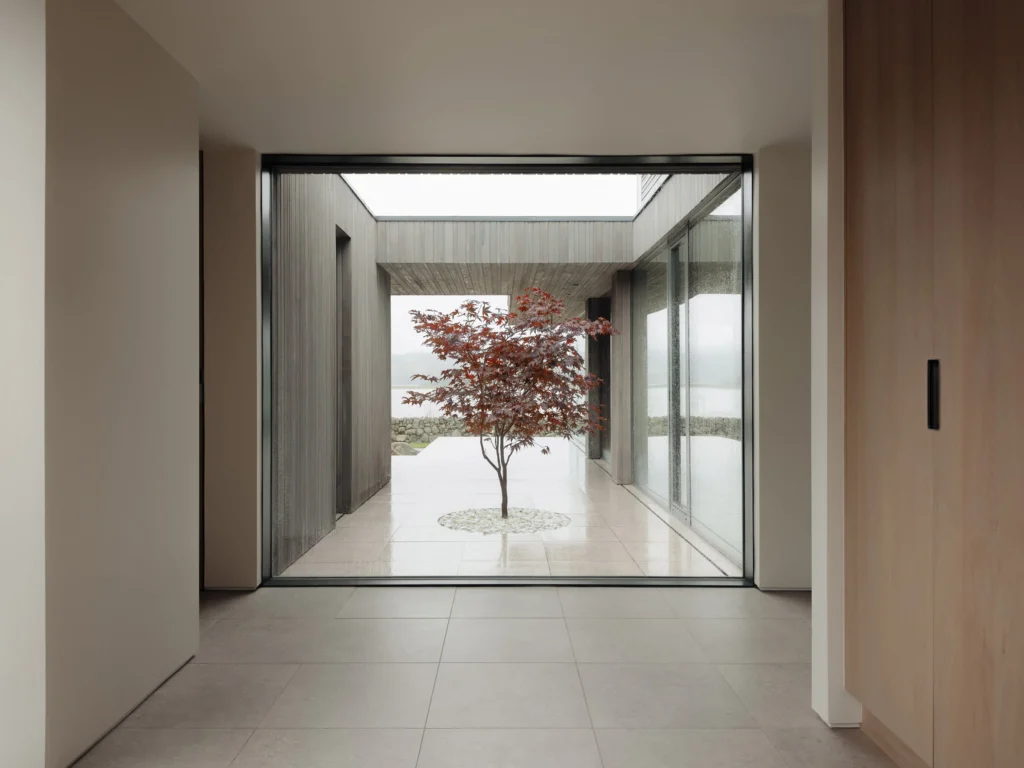 The layout of Tidal House is thoughtfully arranged around a three-sided courtyard. This design effectively separates the main living areas from the artist’s studio, creating a sense of privacy and allowing for dedicated workspaces. A full-height opening opposite the entrance provides a stunning framed view through the courtyard, showcasing a solitary Acer tree and the shimmering waters beyond.