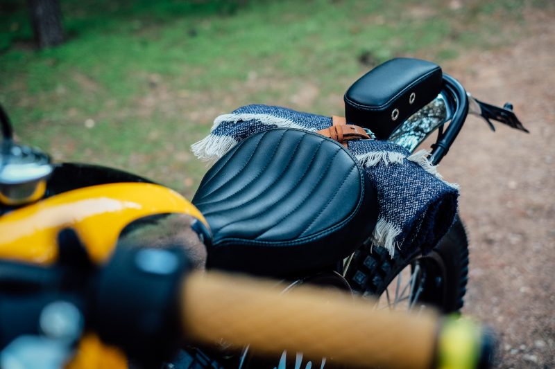 High mounted chrome fenders, Tommaselli scrambler handlebars with Biltwell grips, custom-made side number boards, a leather solo seat with a small passenger pad behind it, and a small blanket and tool roll situated perfectly between the seats complete the look. Urban Mechanics redesigned the rear subframe to accommodate the rear fender and passenger seat. Minimalist LED lights, including bar-end turn signals, help keep the bike street-legal.