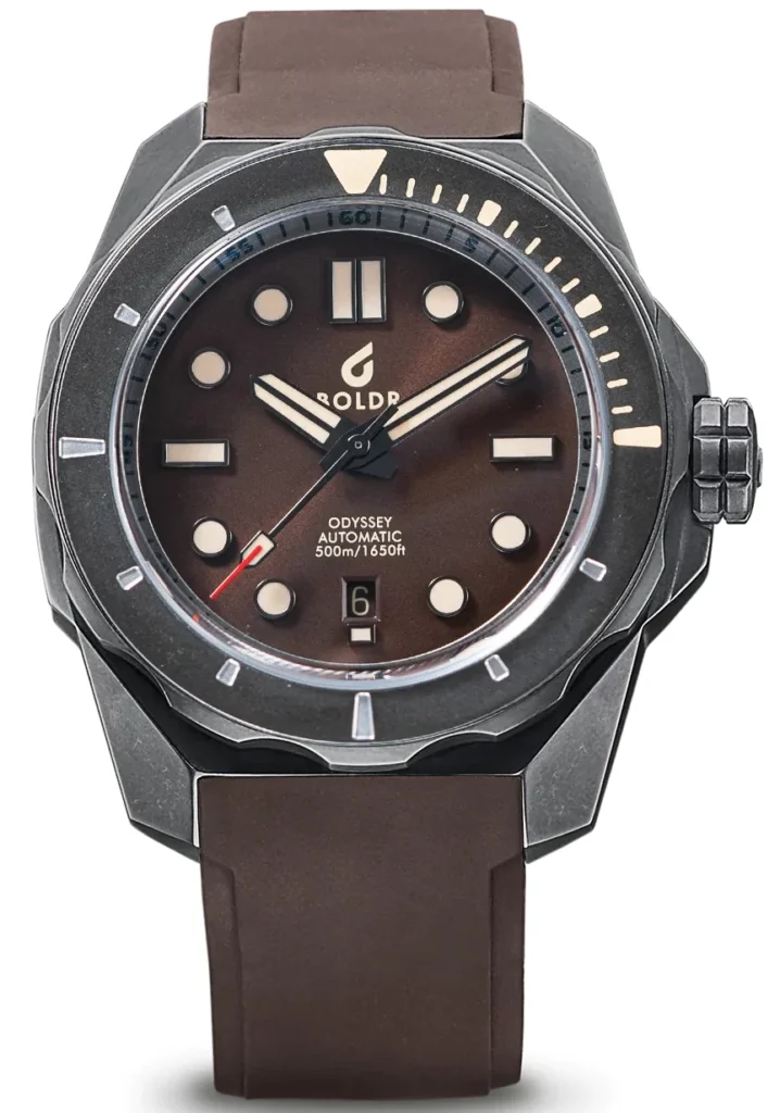 The Boldr Odyssey is a chunky diver’s watch with a 45mm aged stainless steel body, a 50 ATM rating, and a 120-click unidirectional bezel. It is perfect for both diving and other outdoor activities. The watch is powered by a Swiss Sellita movement, which ensures accurate timekeeping. The Odyssey is built to last and will withstand any adventure you throw its way.