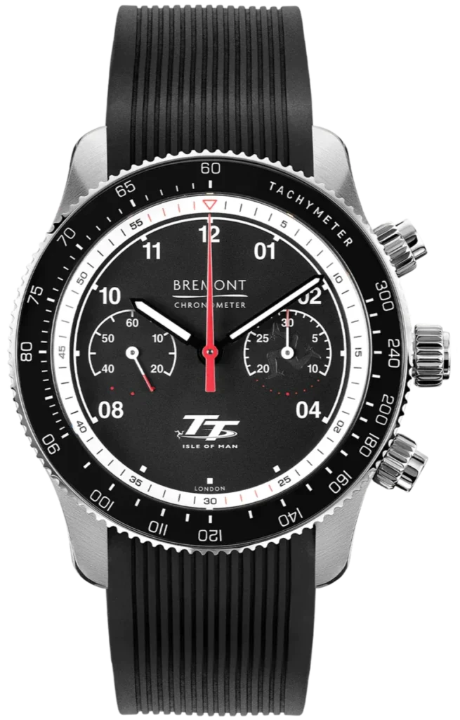 The new 43mm Bremont Isle of Man TT chronograph is a stainless-steel watch with a Trip-Tick case, a bi-directional rotating ceramic bezel, and a 42-hour power reserve. The black dial features the Isle of Man TT logo at the 6 o’clock position and a subtle debossing of the Isle of Man triskelion on the 3 o’clock sub-dial.