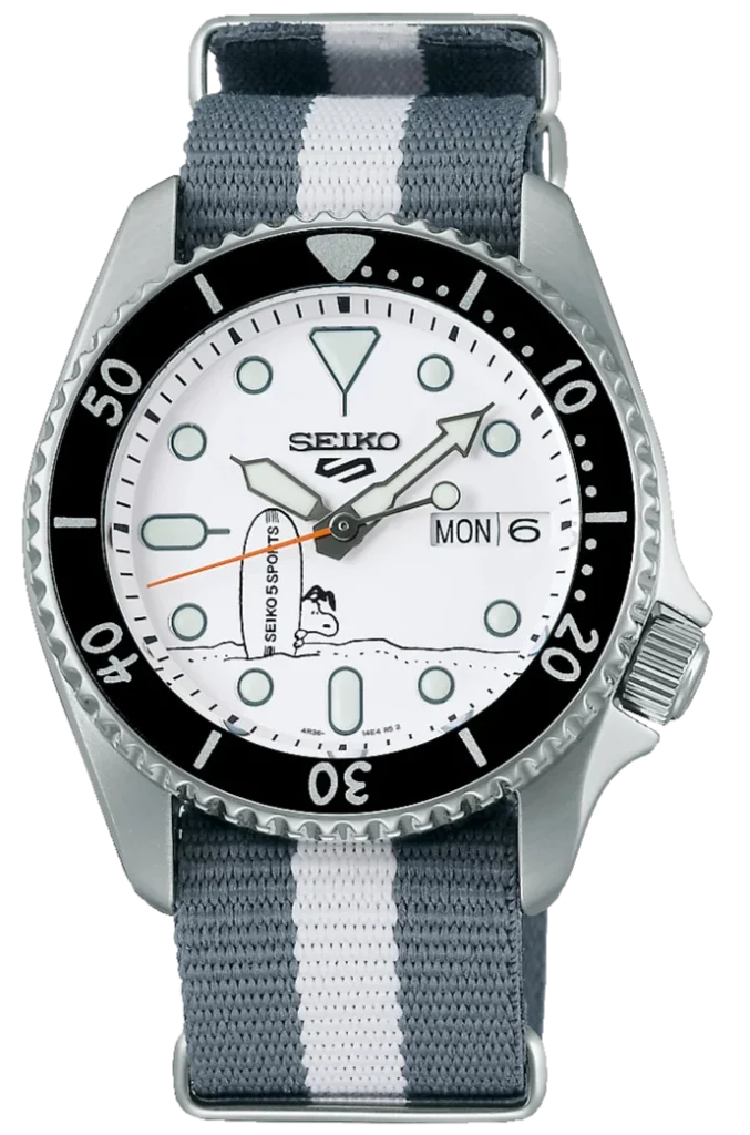 Seiko 5 Sports has released two limited-edition watches featuring original Peanuts illustrations. The watches were designed in collaboration with Peanuts Worldwide and feature drawings from 1963, the same year the Seiko 5 Sports brand was launched. The “Schulz” font, which was used by Peanuts creator Charles M. Schulz, is used for the indices. The specific design features a surfboard as its main theme.