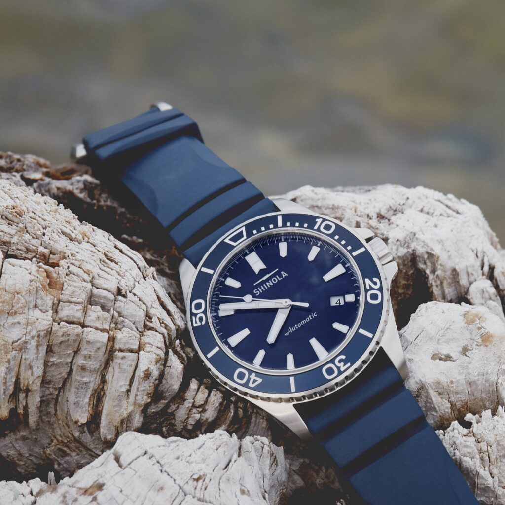 The Midnight Blue Monster Automatic from Shinola, with a glossy blue dial, is reminiscent of the deep blue hue of the Great Lakes at midnight. It has a screw-down crown, dive timer bezel, and water-resistant up to 1,000 feet and it is powered by Swiss-made automatic movement that winds itself with the motion of your wrist.
