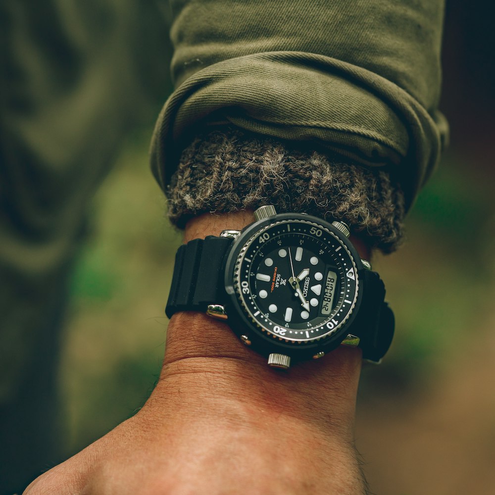 This is a contemporary interpretation of the 1982 Hybrid Diver’s Watch and it is water-resistant to 200 meters (660 feet), following ISO standards and is suitable for scuba diving. Seiko’s reissue, the Prospex “Arnie” Watch keeps all the style, doubles down on the toughness, and updates the tech with solar charging. This won’t let you down when it’s time to get to the choppa.