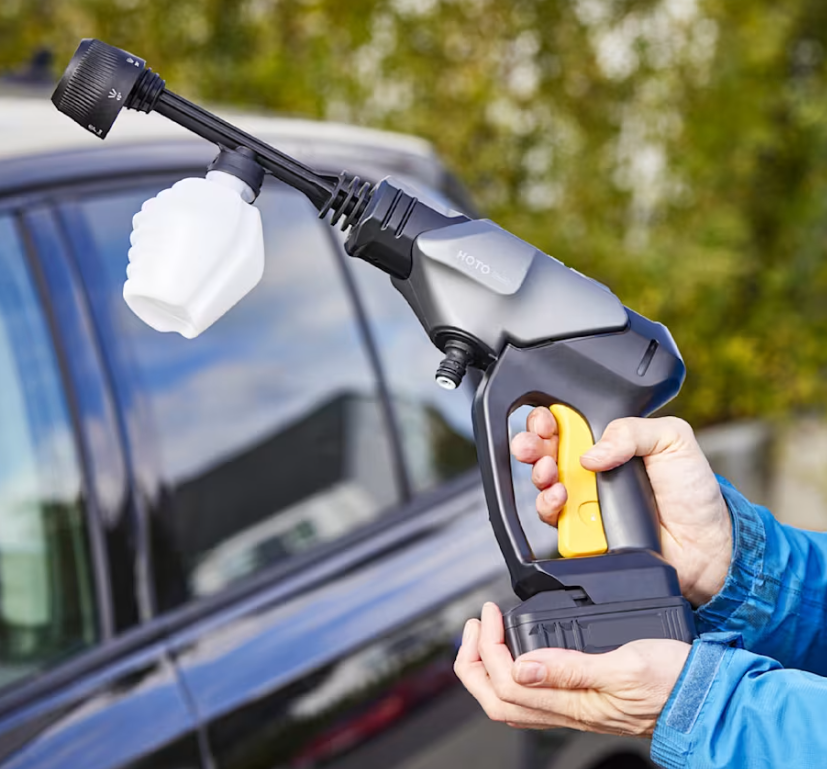 - A cordless pressure washer with a 6-in-1 nozzle for four spraying degrees, shower stream, and foam jetting mode