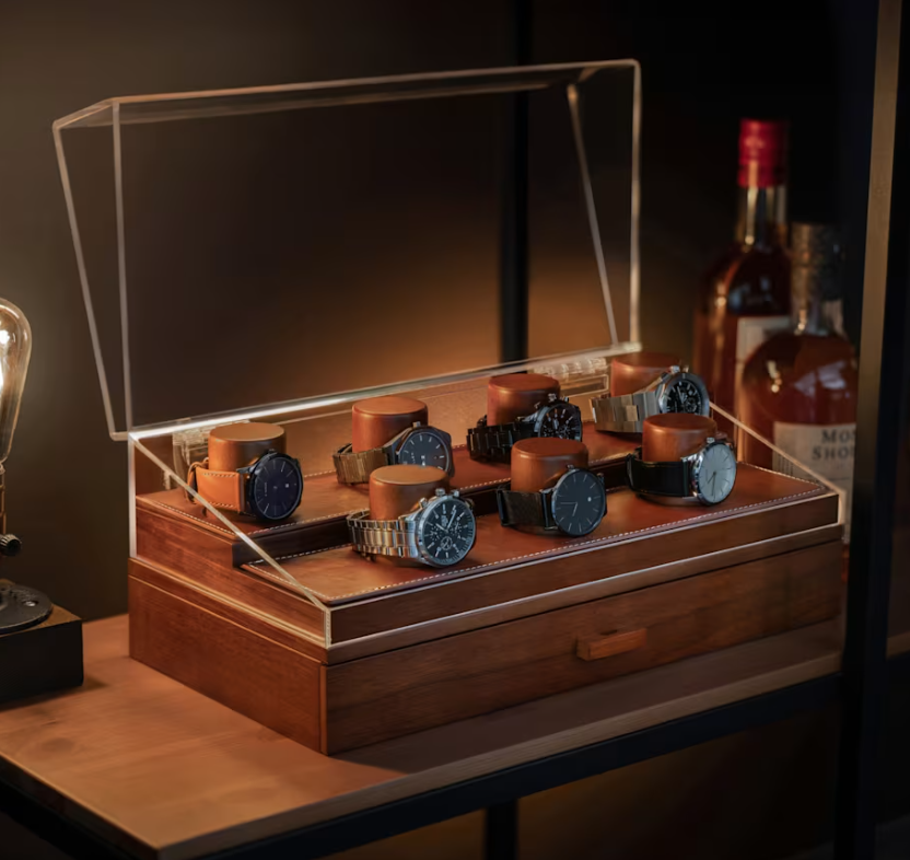 - A two-tiered watch box with 7 solid wood pillars that makes picking out the right timepiece easier than ever