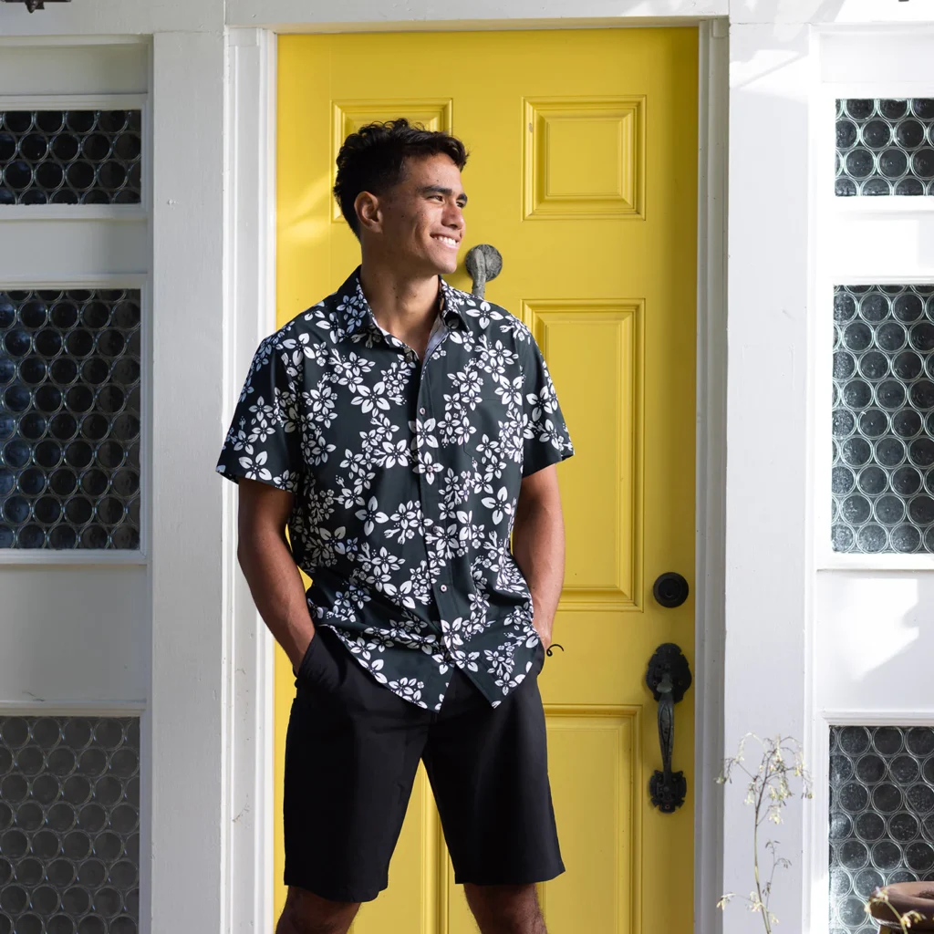 This midcentury-inspired shirt from Western Aloha boasts the flower of the sandalwood tree, a native Big Island tree that is highly prized for its fragrant wood. Printed on a 4-way-stretch performance fabric that is lightweight and moisture-wicking.