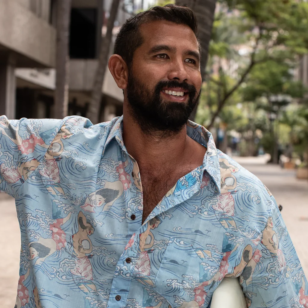 Mother Pearl and the Conch Blower are the two figures swimming among the waves in Mayumi Oda’s“Guardian of the Sea” diptych, featured here in Western Aloha’s awesome Men’s shirt.