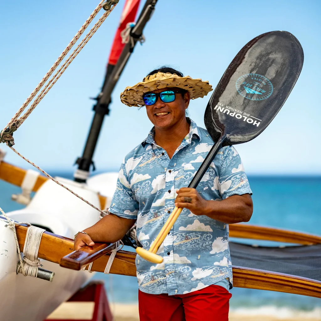 Western Aloha joined forces with fine artist Mike Field, the neighbour down the road in Holualoa, in creating this Aloha shirt.  Mike loves outrigger canoe paddling and has spent plenty of time on the water in Hawaii and Tahiti.