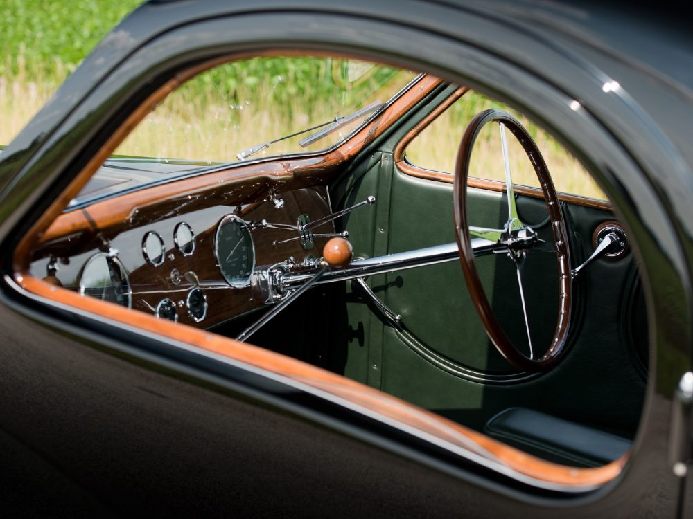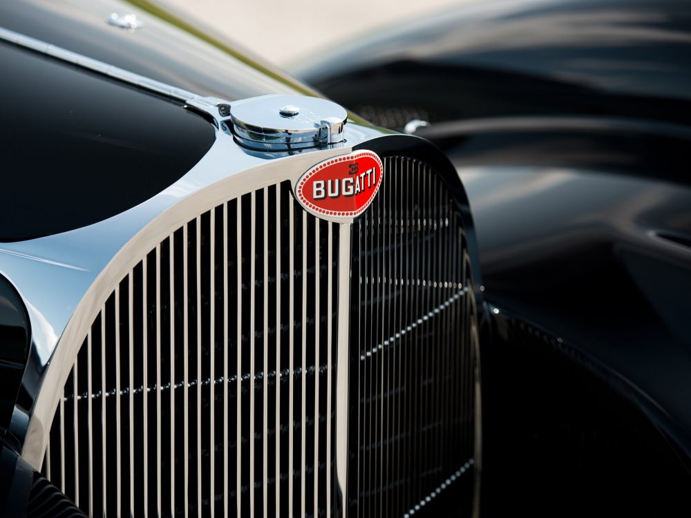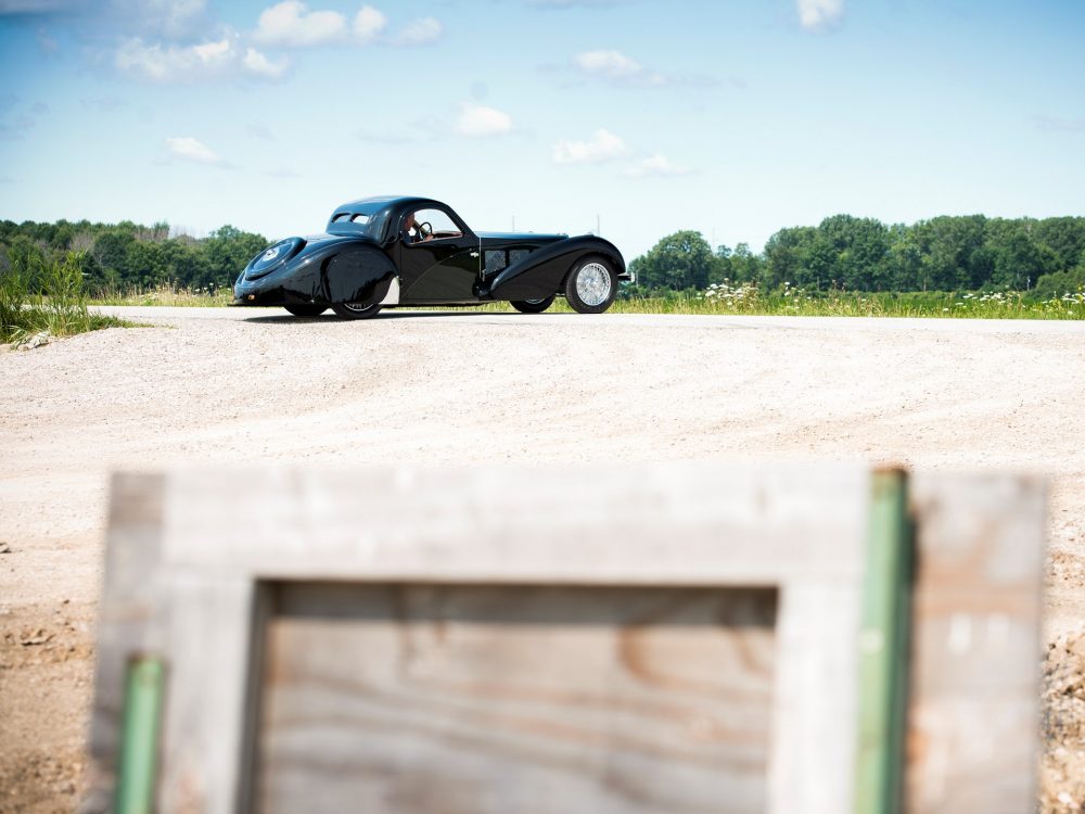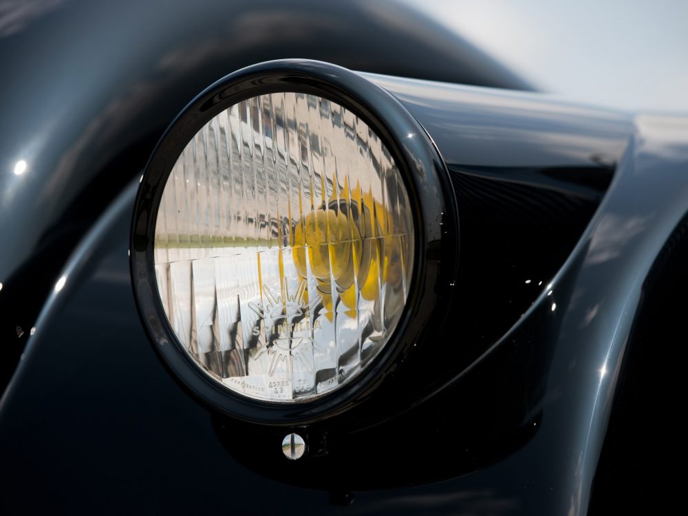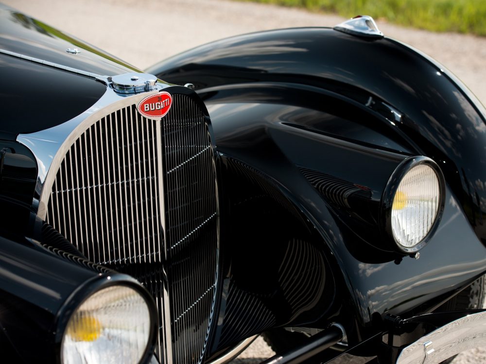 Absolutely astounding visually, the 1937 Bugatti Type 57SC Atalante from RM Sotheby’s was completed on 23 July 1937 with an Atalante body which was finished in black with luxurious, pigskin upholstery. The body configuration, with its low headlight placement between the radiator and front fenders, was exactly the same as the October 1937 Paris show car. It was delivered by the factory just a week later to its first owner, Jean Lévy of Strasbourg, Deputy Administrator of the family owned “Grands Moulins de Strasbourg,” which was a successful grain milling company established by his father, and this is still in business to this day.
