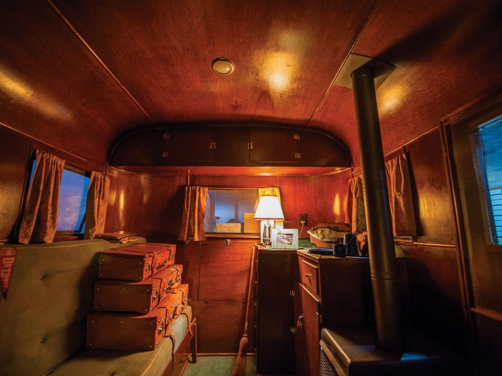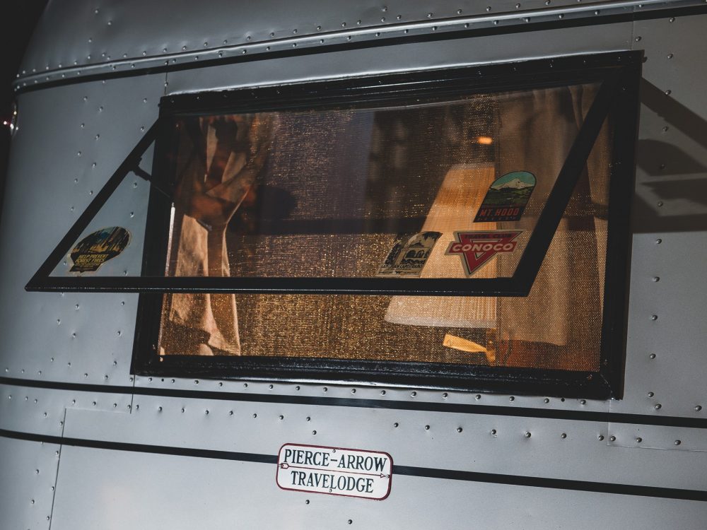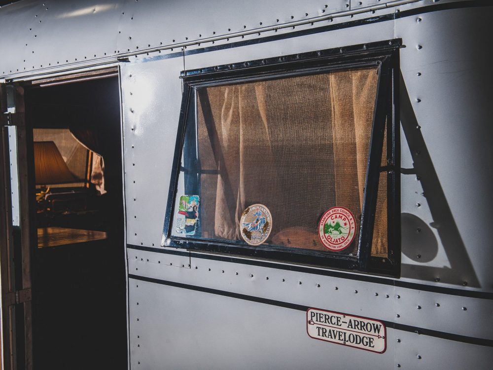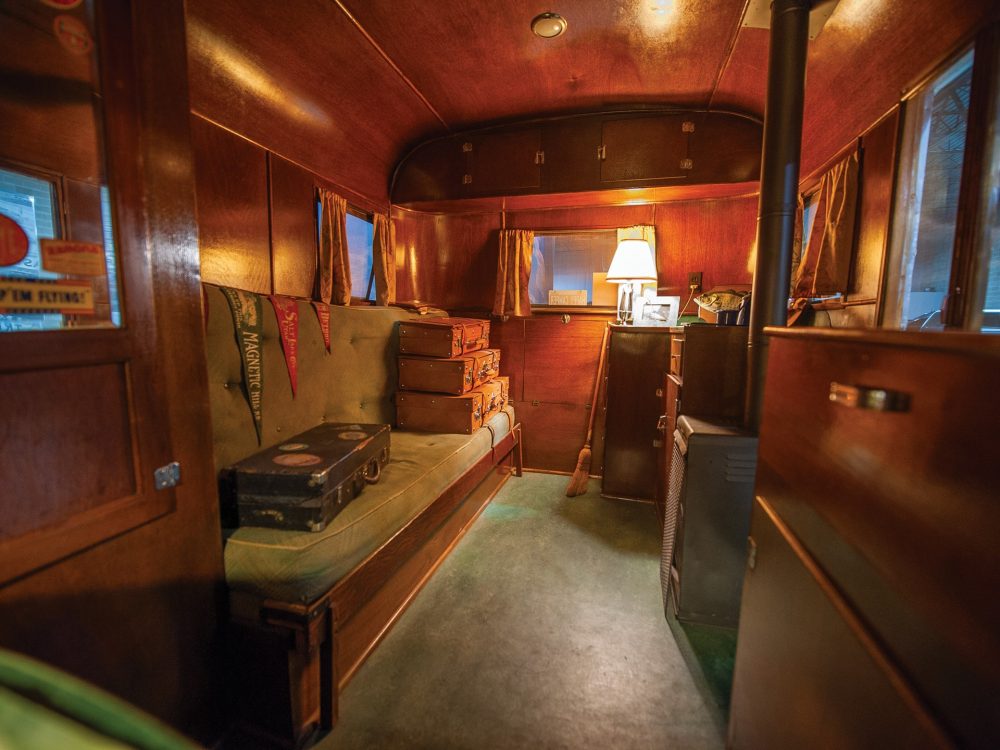 Just as impressive on the inside as it is on the outside, the interior of the 1937 Pierce-Arrow Model C Travelodge has a handsome dinette, with booth-style seating and a linoleum table, which folds into a double bed, as well as an insulated icebox, a hand-pumped sink (designed to draw from an external source), a Prentiss-Wabers Auto-Cook-Kit camp stove, and a wood-burning stove. There is plenty of storage and counter space is provided as well. All windows are fitted with modern safety glass and curtains, and open to mosquito screens, including the rooftop hatch, allowing for well-ventilated living while on the road.
