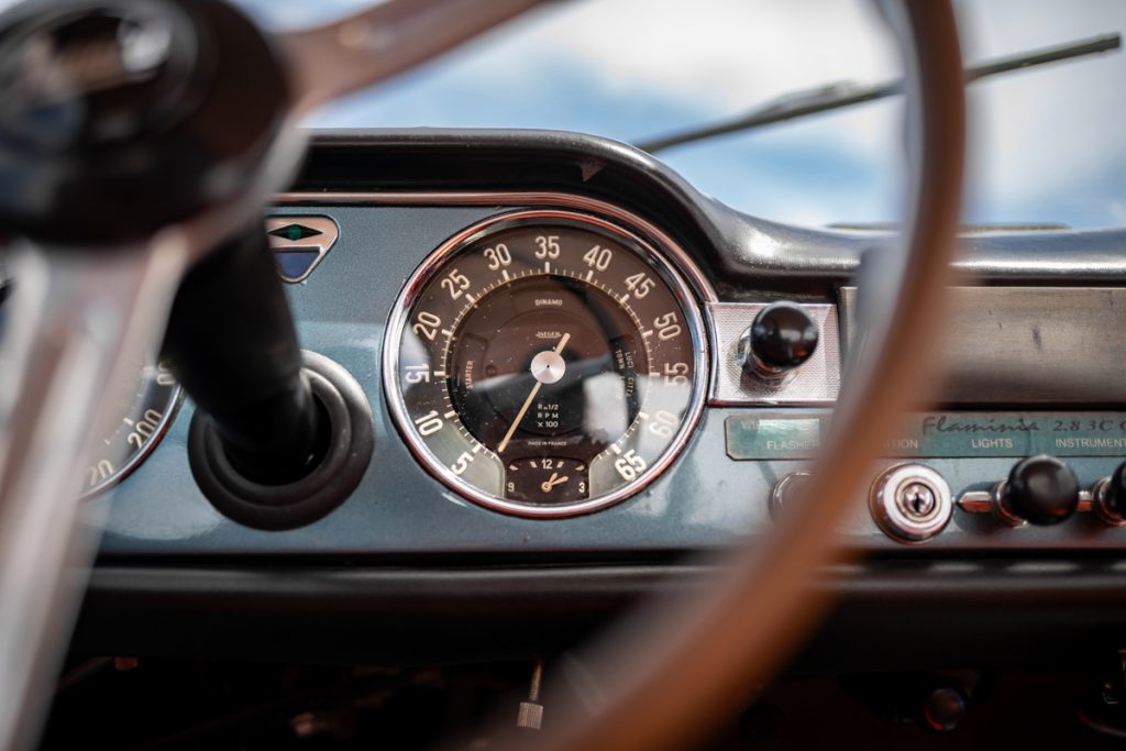 Jaeger instrumentation consists of a 220-km/h speedometer, a 6,700-rpm tachometer, an analog clock, and gauges for fuel level, oil pressure, coolant temperature, and oil temperature. The 1963 Lancia Flaminia GTL 2.8 3C Touring Coupe on Bring A Trailer has entered its final day of bidding which makes the sub-$30k price tag all the more remarkable – don’t miss out.