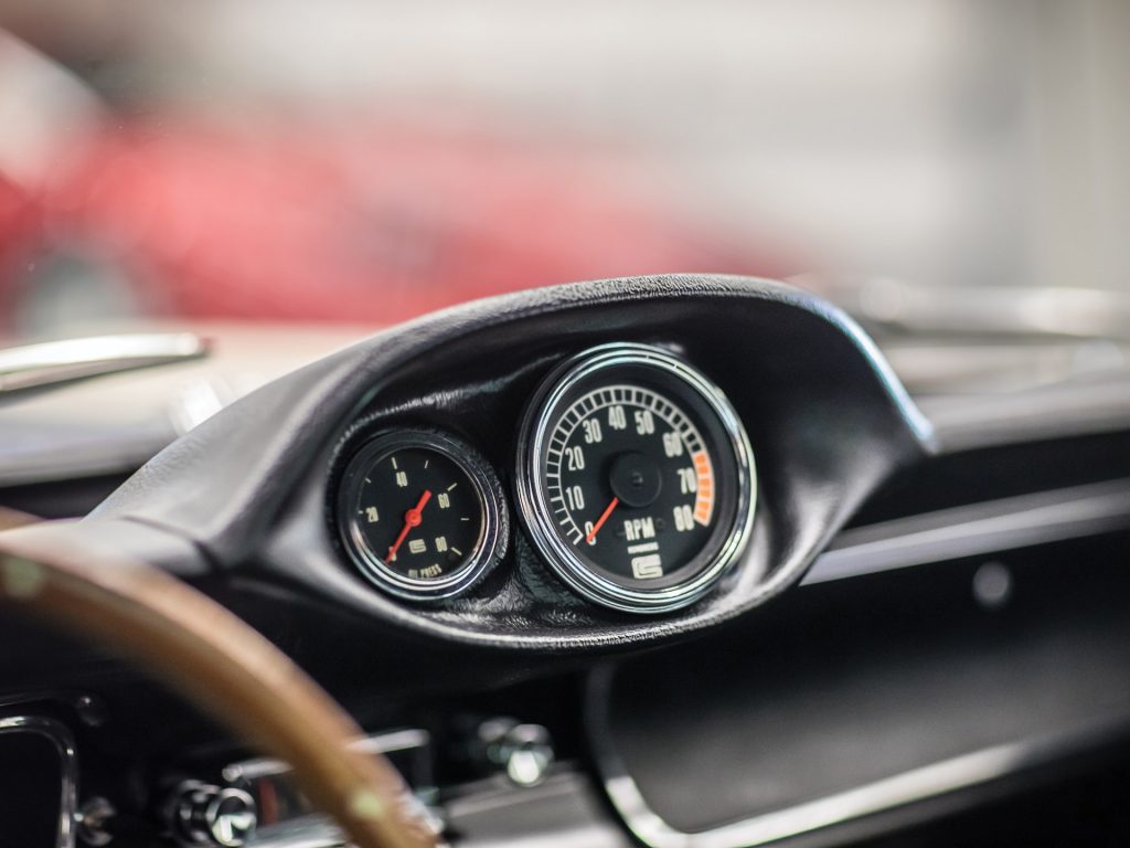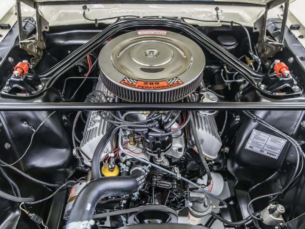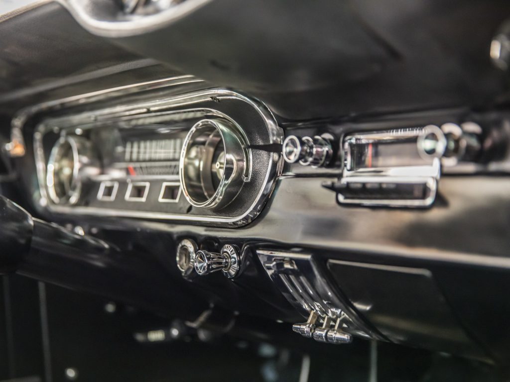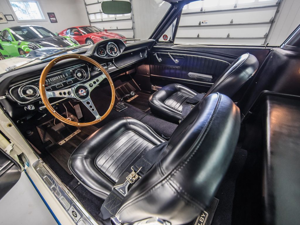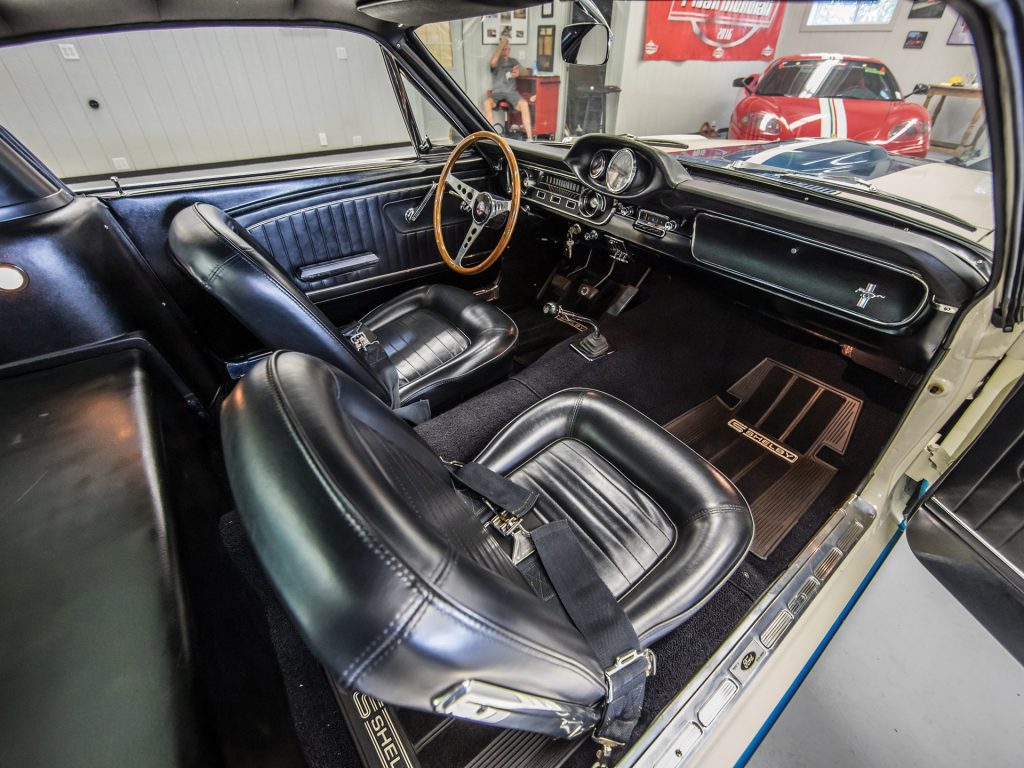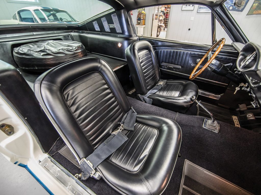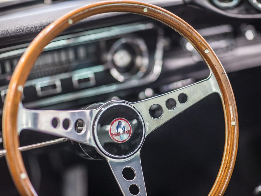 It isn’t just the exterior of this 1965 Shelby that impresses – it’s got an awful lot going on inside as well. The interior comes equipped with comfortable bucket seats, three-inch lap belts, and the original fibreglass package tray that carries a covered full-size spare. In addition, it also has a wood-rimmed steering wheel, radio, and the Shelby tachometer and oil pressure pod. Rubber Shelby floor mats are included to protect the front and rear carpet.