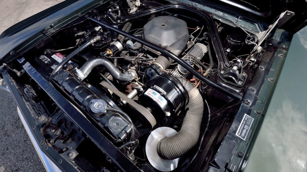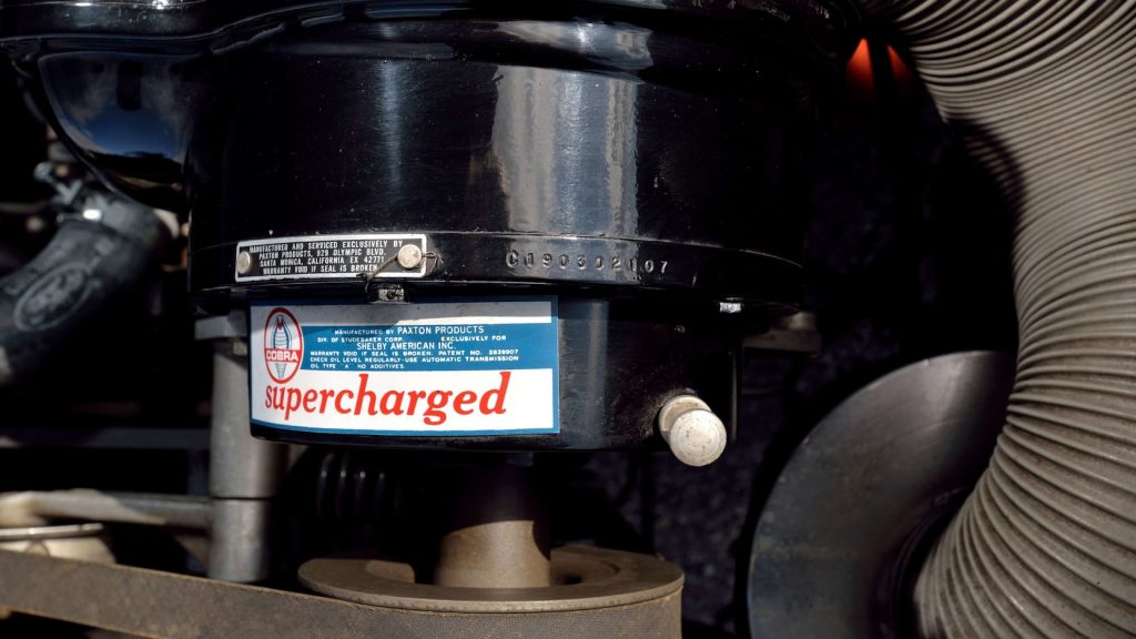 In the mid-1970s, Clifford Hornback of Vinita, Oklahoma, found the car in poor condition, but as he was well aware of its rarity and value, he began a careful restoration with the help of noted Shelby enthusiast Jim Wicks. The correct Shelby components were retained, which included the original engine and factory suspension pieces. The only two alterations were the additions of a Paxton supercharger and Hertz Gold over the top “Le Mans” stripes to match the rocker stripes on the car.