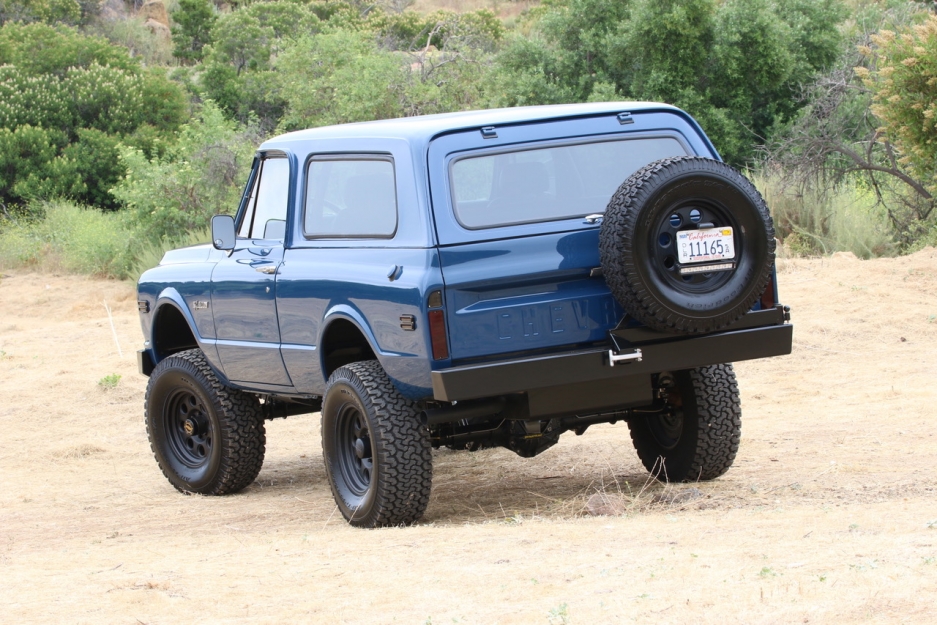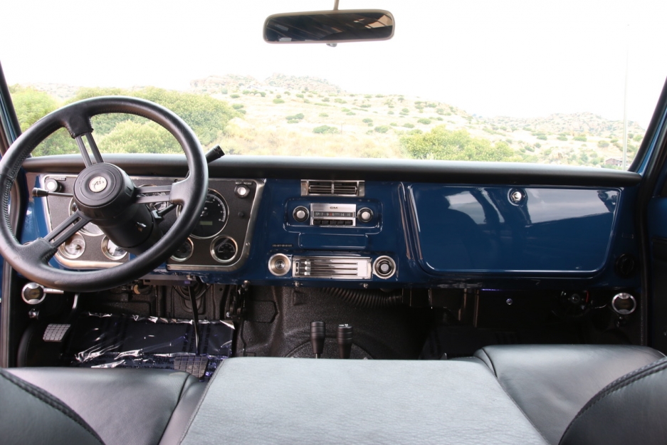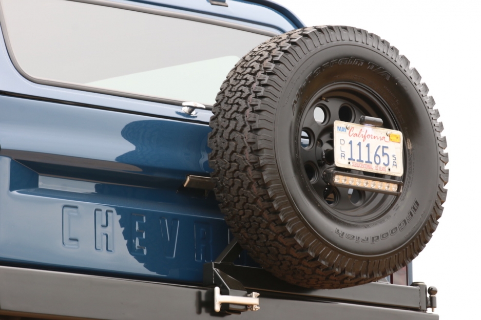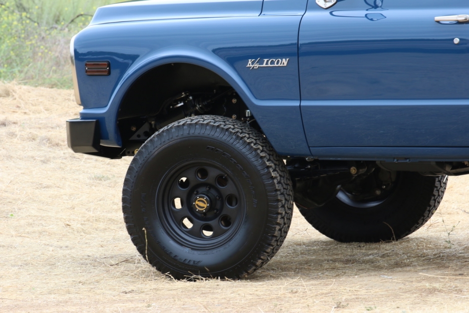 Made for hitting the open road in search of adventure, this 1970 K5 Icon 4×4 Reformer has American Racing black Teflon ATX 17” wheels with BF Goodrich 315/70/17 All Terrain tires that make short work of most surfaces. It also comes with custom powder coated steel front and rear bumpers. The rear bumper has a braced tire carrier, which has been designed with a pivot lock to hold it at 90 degrees, until pin is pulled.