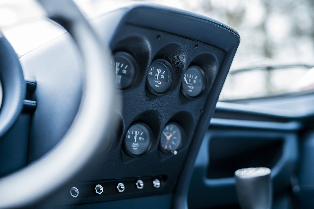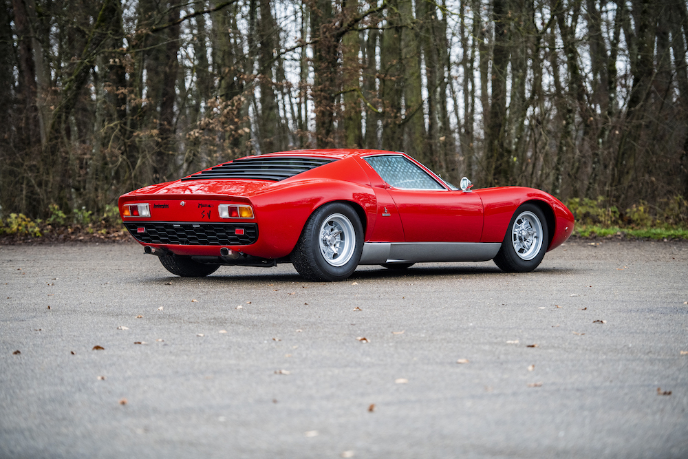 This 1971 Lamborghini Miura P400 SV from RM Sotheby’s was delivered to its first owner in Germany in May 1972, specified in Rosso Corsa with a dark blue interior. Then, between 1972 and being acquired by its second owner in 1977, it is known to have had an aesthetic conversion to resemble the one-off 1970 Miura ‘Jota’. The Jota or SV-J was a testbed built at the behest of Lamborghini’s chief test driver Bob Wallace, with the ultimately unsuccessful aim to take the car racing under the FIA’s appendix J regulations. In spite of this, a handful of SV-J Miuras were commissioned for particular owners from the factory, whilst others underwent conversion at a later date at their owner’s request.