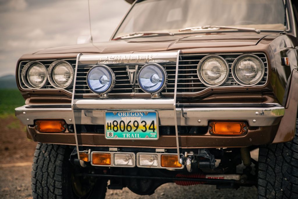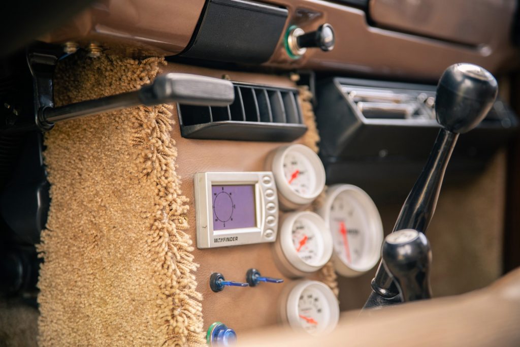 Black-painted 15″ steel wheels with chrome hubcaps are wrapped in 31×10.5″ Wild Country Radial XTX Sport tires. The solid front axle was sourced from a 1980 Toyota 4×4 pickup, and manual front lockers have been fitted at the front wheels for a first class performance out on the open road. Suspension modifications for this build include a 3″ lift in the front and a 4″ lift at the rear, rear air shocks, and heavy-duty front and rear sway bars.