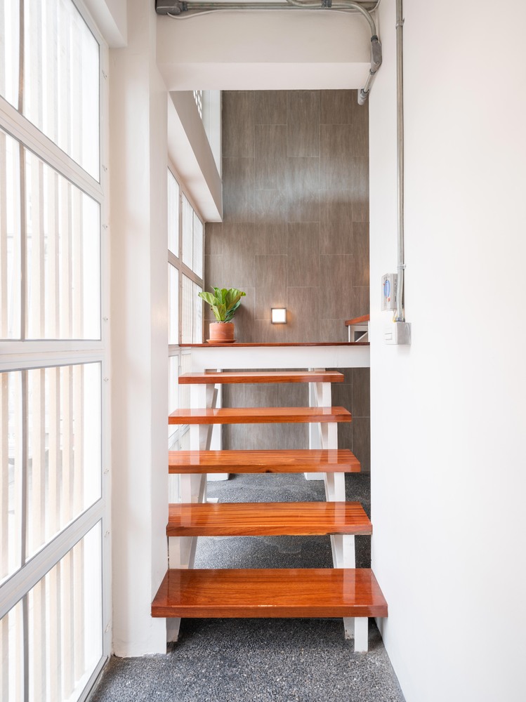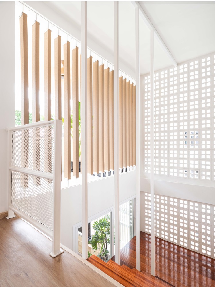 It’s clear that the stairway of this existing townhouse in Bangkok has an important role to play in its overall functionality and is more than just a circulation point for the property. It is the core of the project as it brings natural light and ventilation to the whole building. This vertical space has been completely transformed from a classic indoor circulation to a semi-outdoor space in connection with its tropical environment. Concrete blocks and wooden screens provide privacy to the residents while delivering natural daylight into each floor and allows natural ventilation to flow along.