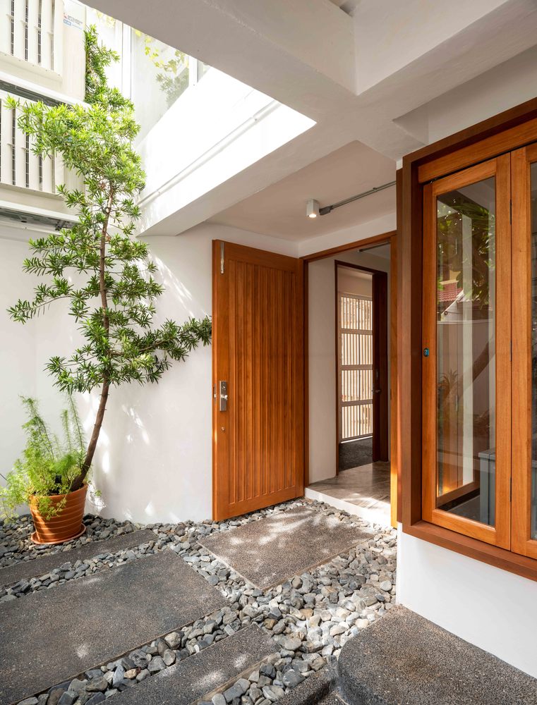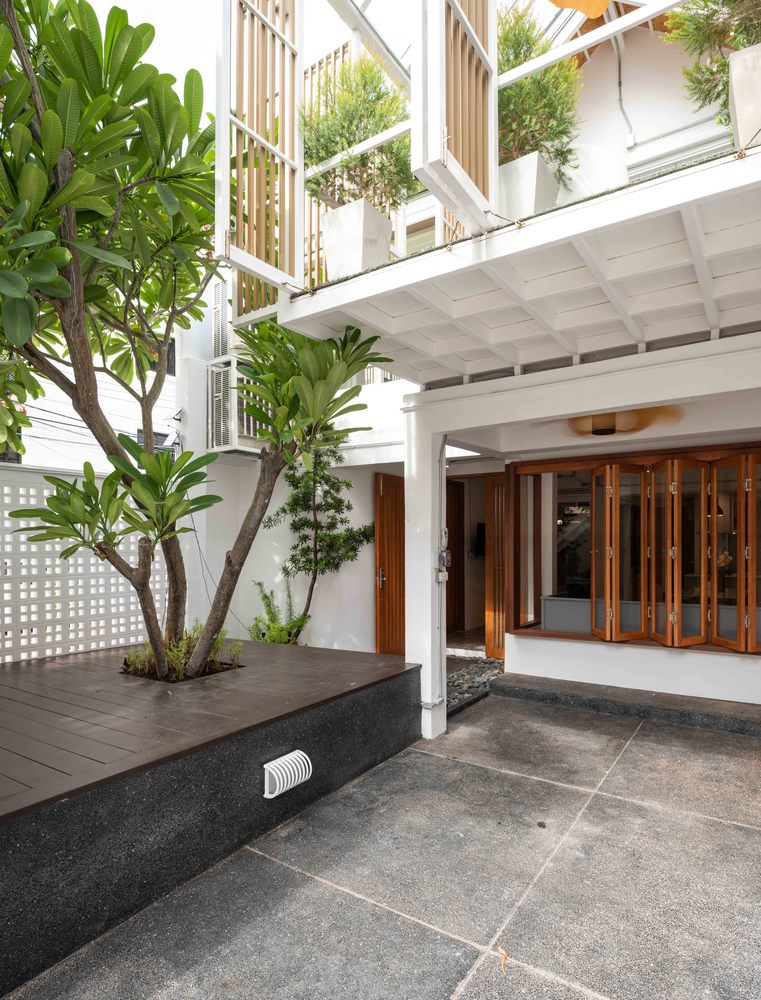 The 2 in 1 House in Bangkok offers an impressive amount of flexibility in terms of how it can be used and the stairwell becomes an adaptable element of the property’s design. If the building is inhabited as a single house, the stairs are the private vertical circulation that distributes the three floors. If the ground floor and upper floors are independently used as two housing units, the stairwell can be isolated by closing a gate and therefore becoming the main entrance of the upper residence with an entrance on the side street while the ground floor residence is accessible by the front of the building.