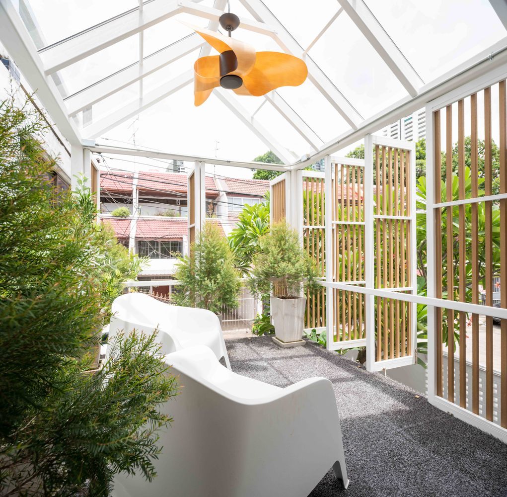 As with a lot of properties in Bangkok, the 2 in 1 House has an understated aesthetic achieved through the use of an array of natural materials. This includes tropical wood steps and screens or concrete blocks and stone surfaces which are emphasised by the predominance of white surfaces and minimal lines. Therefore, a lot of vegetation is evident and used to contrast the simplicity of the design and gets along with the tropical feeling the architectures wanted to be a dominant feature of the house.