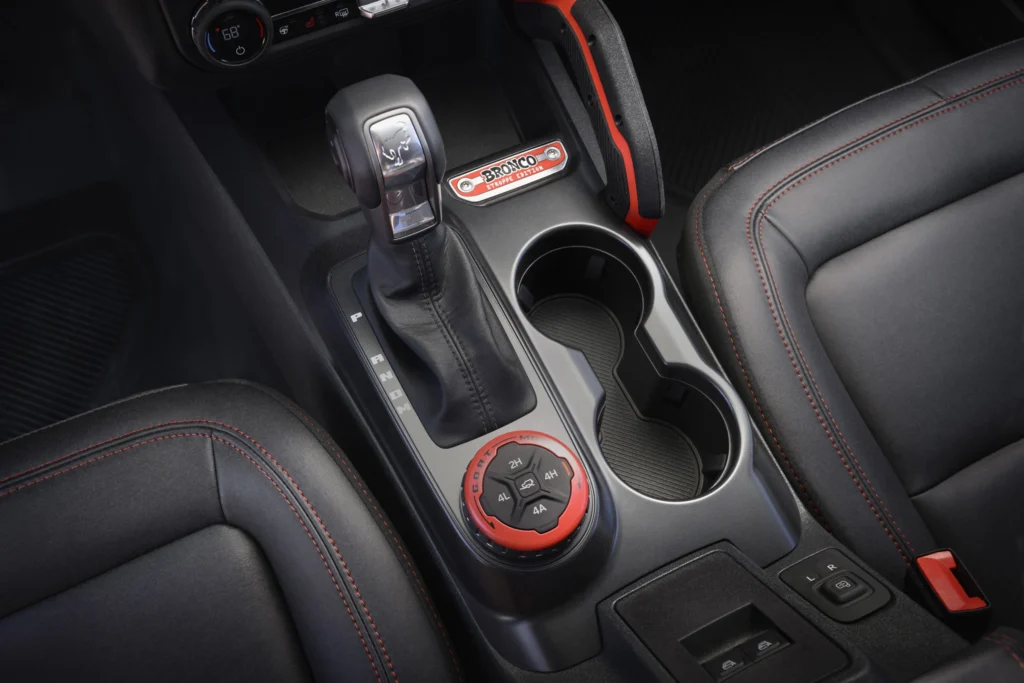 Step inside, and the Bronco Stroppe Special Edition continues to impress. The cabin features a white instrument mid-panel—first seen on the Bronco Heritage—with added Code Orange accents throughout. The “Bronco” wordmark on the dash, the G.O.A.T. mode dial bezel, and the insides of the grab handles all receive the Code Orange treatment, while contrast stitching on the dash topper and seats ties the look together. The centre console is adorned with a unique Stroppe Special Edition badge, cementing its status as a true collector’s item.