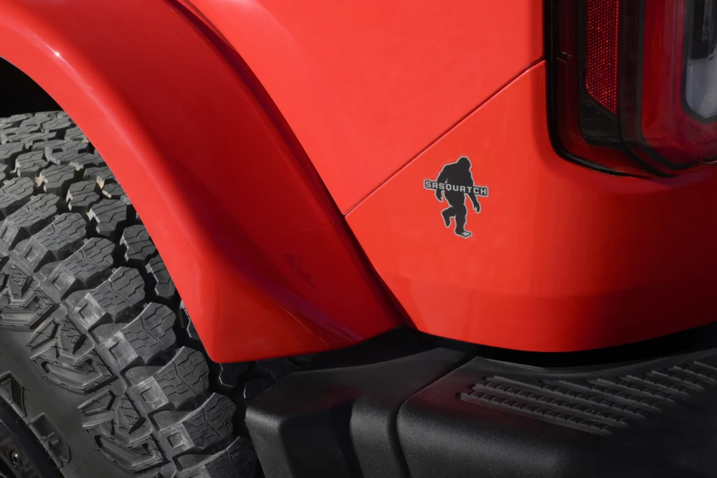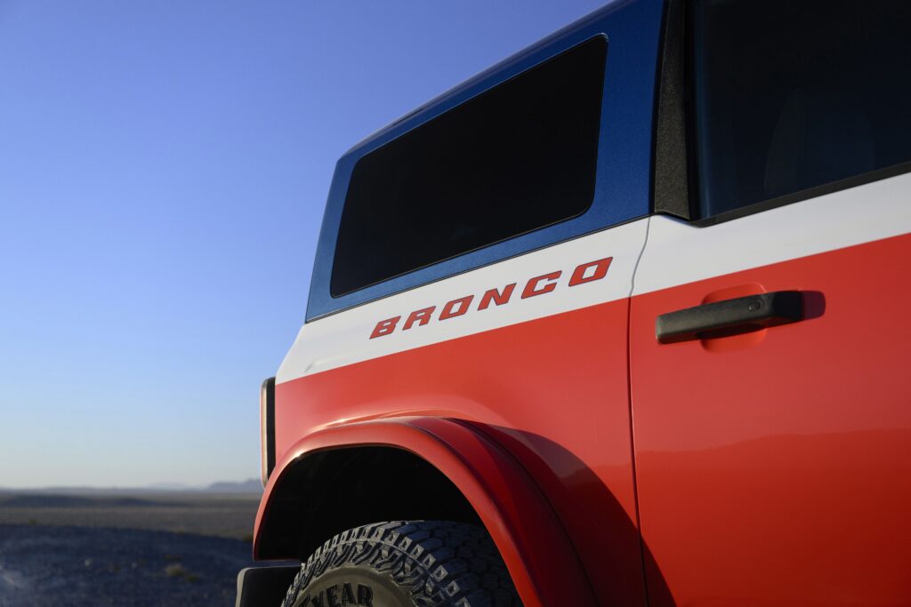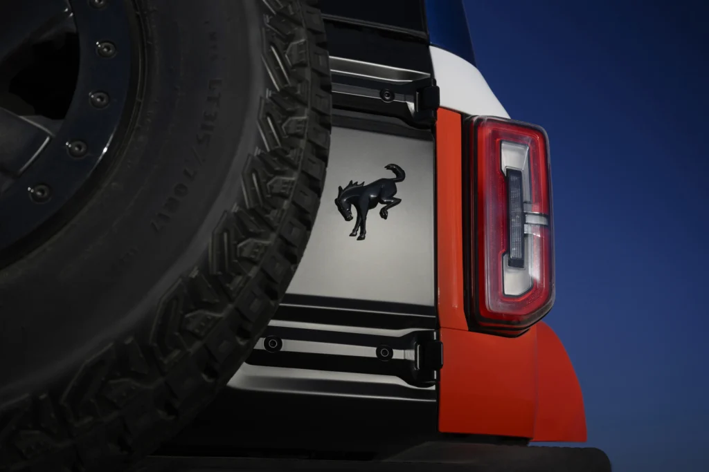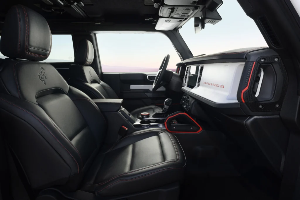 The design also features high-clearance fenders finished in Code Orange, unique removable side steps with integrated rock rails, and 17-inch beadlock-capable wheels with a matte-black beadlock ring and gloss-black spokes. The matte black tailgate further enhances the Bronco’s rugged appeal, ensuring this special edition is ready for anything the trail might throw its way.