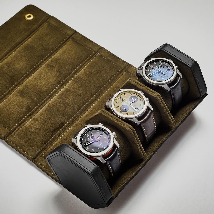 There are plenty of eye-catching features to this Bennett Winch Watch Roll which help set it apart from the competition which includes a unique hexagon design, a flat-bed preparation area for the watches when rolled out and room for three watches on removable central cylinder. (£550)