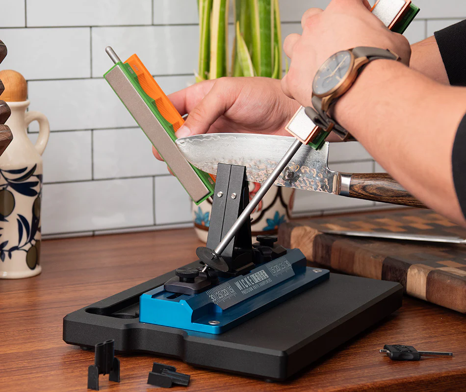 While perhaps stretching the definition of “portable” to mean “easily transportable,” the Wicked Edge Generation 4 Pro is the undisputed champion for those who demand uncompromising precision, regardless of location. Engineered for high-volume use by serious enthusiasts and professionals alike, this system allows you to achieve razor-sharp edges with remarkable speed and consistency. Its key advantage lies in its ability to set both sides of the blade simultaneously, guaranteeing perfectly symmetrical bevels and significant time savings. The robust vise provides the strongest and most secure clamping experience, accommodating blades up to 3/16″ thick with unwavering stability. For the ultimate in angle control, the Generation 4 Pro allows you to fine-tune your sharpening angle in minuscule 0.05° increments, ranging from 12° to 33° per side. It comes equipped with a comprehensive set of 100/200, 400/600, and 800/1000 grit packs, ensuring a complete sharpening progression to achieve that coveted mirror polish. Built with Type 2 and Type 3 anodized aluminum components, its durability is as impressive as its performance. Proudly designed, manufactured, and assembled domestically, the Generation 4 Pro is the pinnacle of portable (in a relative sense) sharpening technology for those who accept nothing less than perfection.
