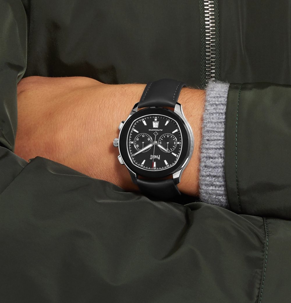 This limited edition Piaget ‘Polo S 42mm’ watch is a knowing nod to the Swiss watchmaker’s engineering prowess. It is powered by a 1160P calibre self-winding mechanical movement which has been developed from beginning to end in La Côte-aux-Fées, and it boasts a precise column-wheel chronograph complication which can be viewed and admired through the sapphire-glass case back. The completely round case, which has been cut from black ADLC-coated stainless steel, is offset with a cushioned and striking guilloché dial – a series signature and design first in the horology world. You can switch out the leather strap for the rubber one in the box when you’re off in search of outdoor adventure. (£12700)