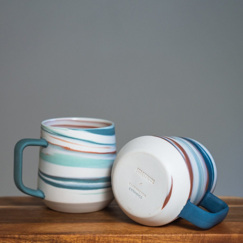 Ecletticos and Clay Factor have partnered together to launch a limited-edition batch of only 100 hand-thrown, porcelain ceramic mugs in two exquisite designs. The clay used in these mugs is sourced in the Pacific Northwest by Clay Factor. They are hand-thrown in their Portland studio and they will ship from there as well. Made in the USA.