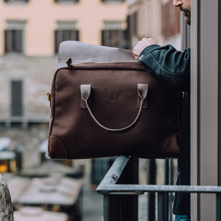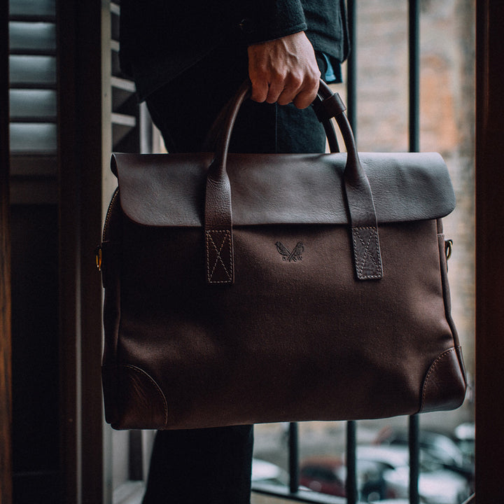 From boardrooms to laid-back member’s clubs, The Bennett Winch Brief fits in wherever you do your business deals. Hand crafted in England, the lightweight waterproof cotton canvas is matched with a leather hood and trim for a sophisticated yet understated aesthetic. The slimline design is surprisingly spacious – inside you’ll find a padded laptop sleeve and internal pockets to keep cables and devices in order. A leather panel on the reverse slips over the handle of any wheeled suitcase and the external pocket has space for your phone and passport, making it the perfect travelling companion.