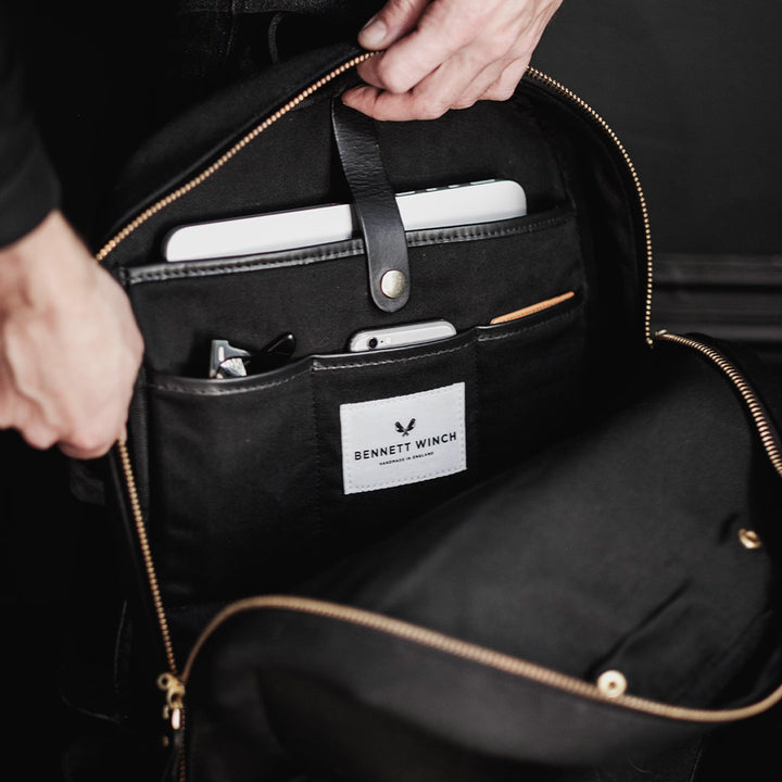 An elegant and functional backpack, purpose-built to hold a day’s essentials. With a slimmed-down silhouette, the Bennett Winch Backpack contains a padded laptop pocket that makes sure your computer is carried securely, while a detachable waterproof compartment is ideal for gym gear, grooming products or shoes. The main compartment opens with a double zip which runs down to the bag’s leather base, which allows for belongings to be packed and unpacked rapidly, while a concealed front pocket gives easy access to your EDC essentials.