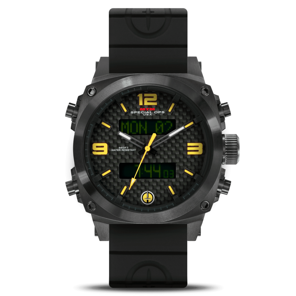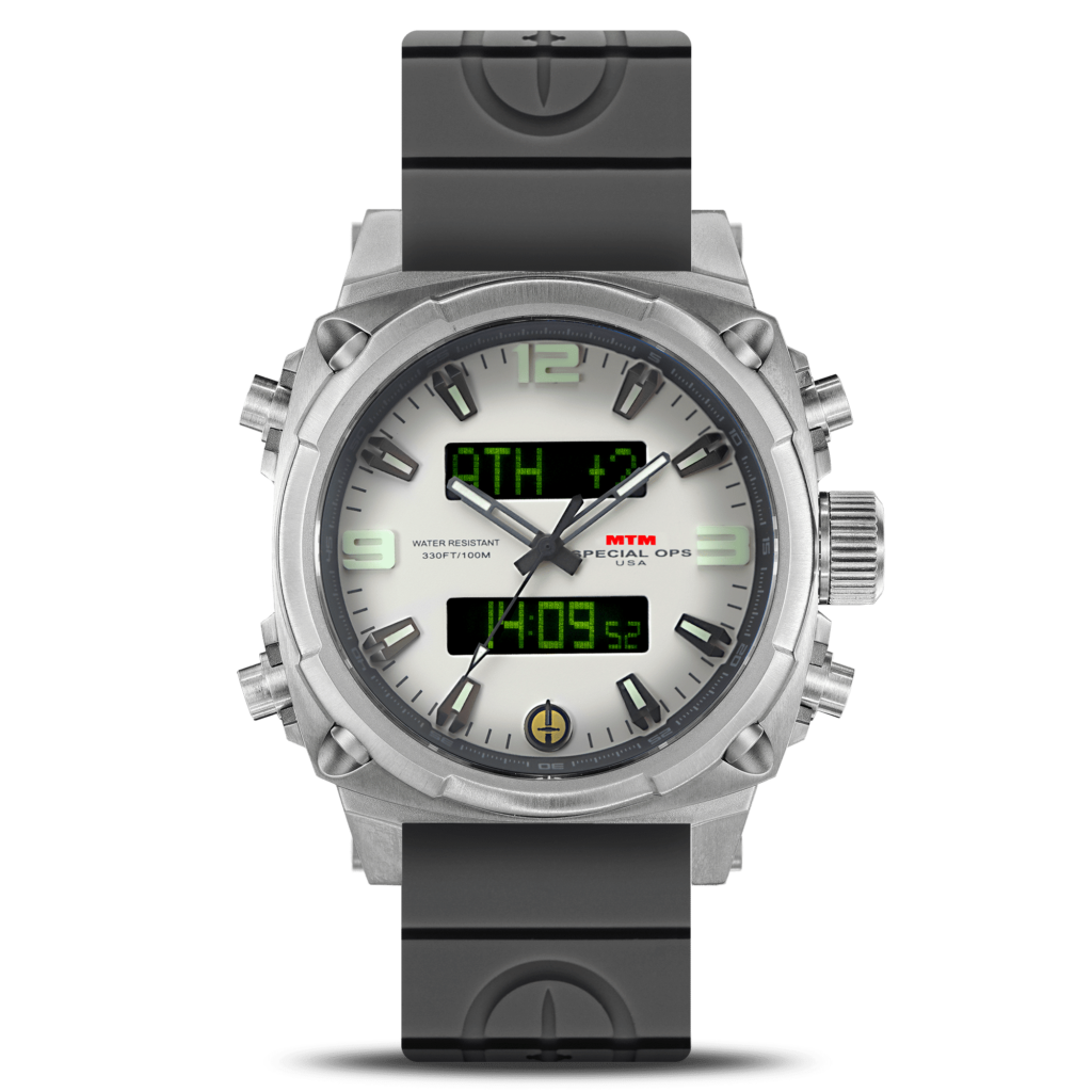 The MTM Special Ops Silver Air Stryk II is a military men’s watch offering precise analog and digital timekeeping. The digital display can be deployed as a compass, time/date display, provide time for different time zones, an alarm, and much more. This bold, no-nonsense timepiece also features luminous index and hands, making it easy to read in low light conditions. Moreover, its solid titanium case and 330-feet of water-resistance put this watch on another level. Built for everyday tactical use, the Silver Air Stryk II is ready for action.