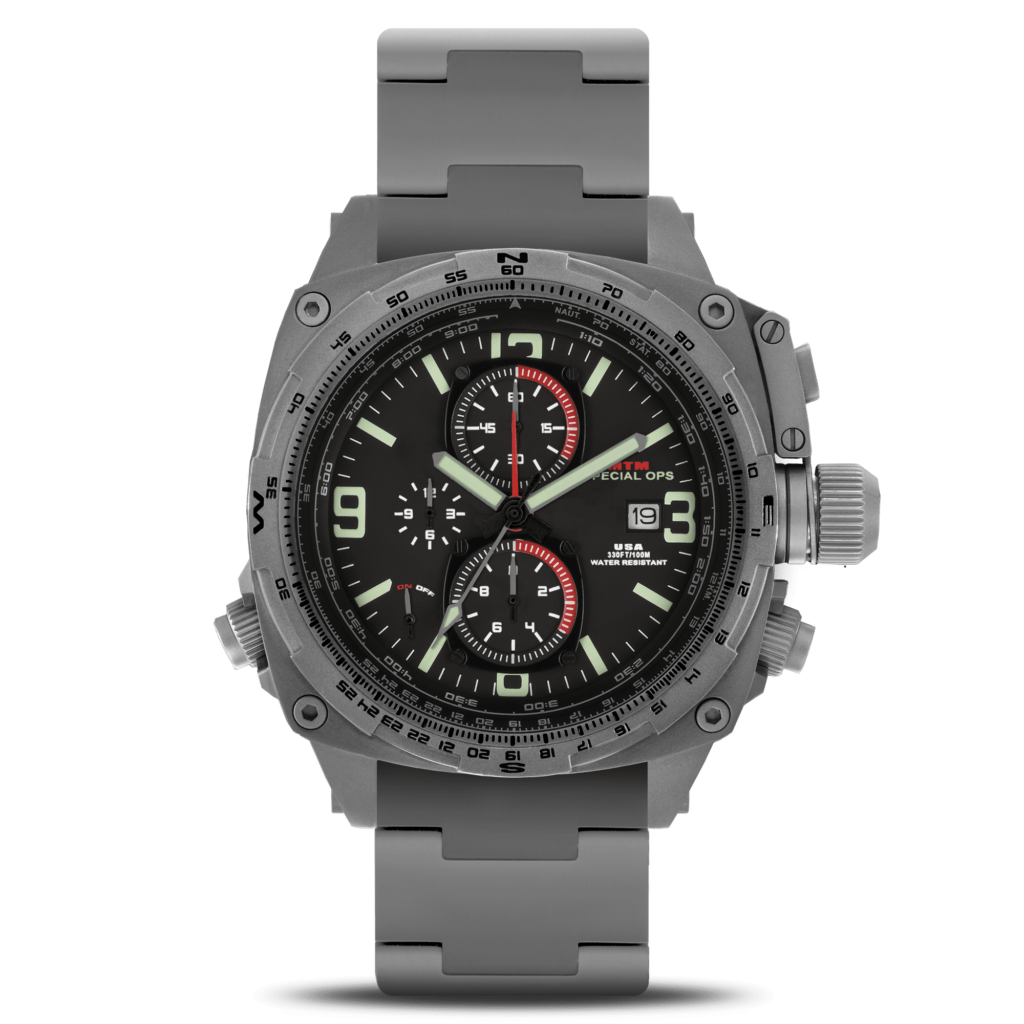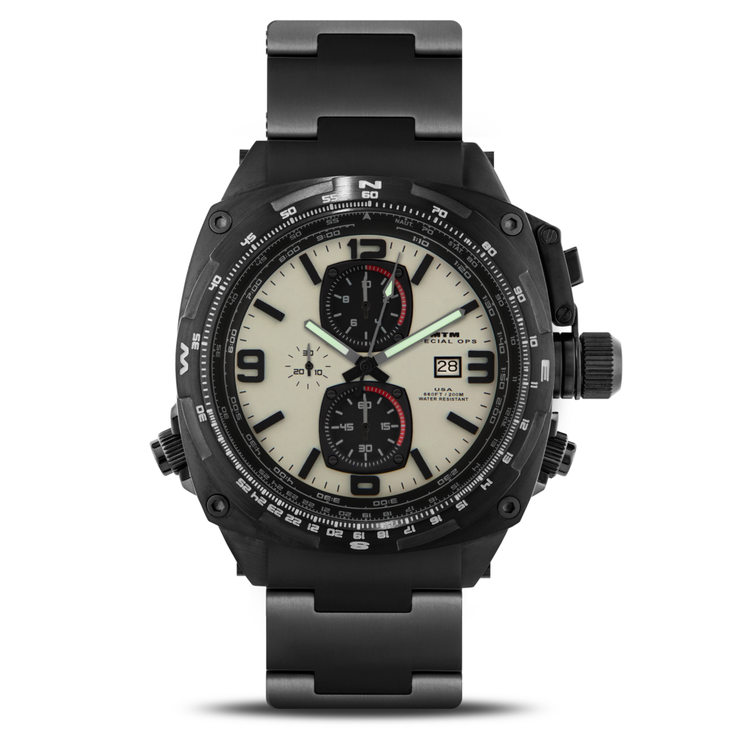The MTM Special Ops Black Cobra 47 watch delivers a sophisticated and stylish aesthetic, meant for everyday use. Its unparalleled strength and robustness is second to none, boasting a high-grade titanium case with a locking screw-down crown and pushers. As an aviator/pilot watch, this tactical military timepiece is ideally suited for traveling, whether in the air, on land or by sea. The Black Cobra 47 boasts a sleek shine that will compliment your lifestyle and watch collection.