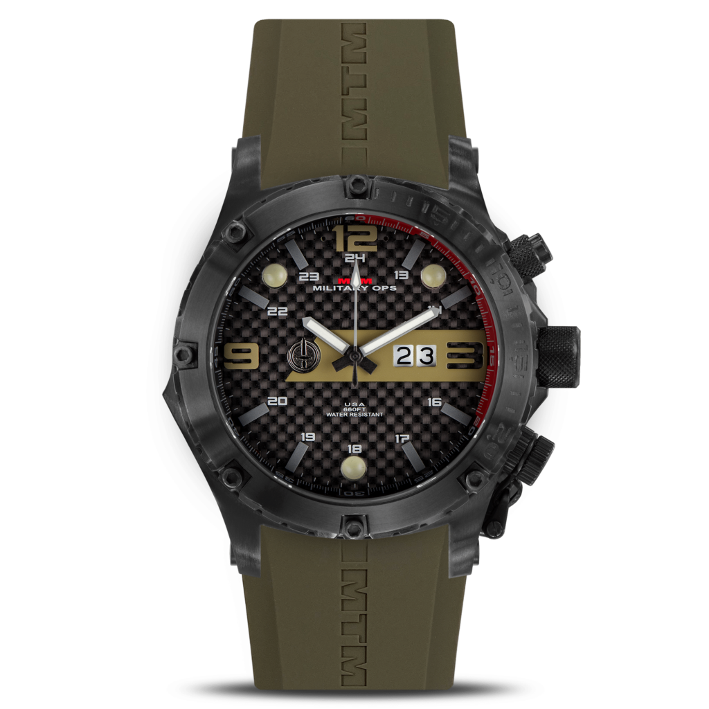 The MTM Black Vulture is a military tactical watch purpose built for the most extreme and strenuous conditions. Its lightweight case, constructed of solid titanium, fits comfortably on your wrist, while the scratch-resistant sapphire glass provides full dial protection. Underwater, this men’s watch will perform up to depths up to 660 feet/200 meters without any issue. As a Special Ops watch, the Vulture packs four tactical light-modes that can be turned on at a moment’s notice.