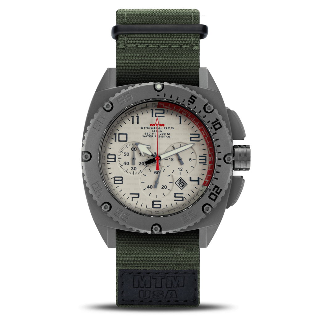 The Grey Patriot chronograph watch from MTM is a rugged and uncompromising military timepiece for men with a NASA-grade carbon fibre or brass dial, sub-dials and a solid titanium case. Perfectly protected with a locking screw down crown to guarantee a water resistance depth of 660 feet. As one of the best military watches for men, the MTM Grey Patriot is a classic and favorite for active duty military, veterans, police officers and firefighters. This durable and dynamic watch represents the strength of all Patriots and their freedom.